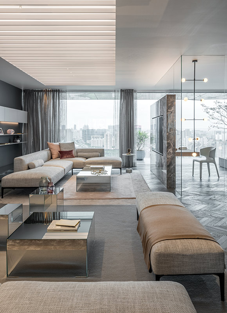 Located in one of Shanghai’s inner city circles project developer China Eagle Group (CEG) realized with the „CEG Schwarzwald“ project an innovative and sustainable concept for urban life in the chinese metropolis. For one of the towers two show apartments have been designed, representing various color, light and material compositions. The „Shades of Grey“ apartment offers to the visitor a relaxed and elegant private world on a surface of 250 sqm, at floor 27.