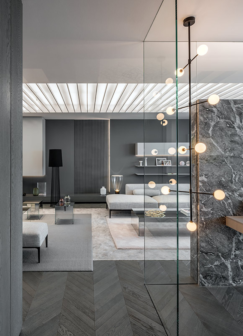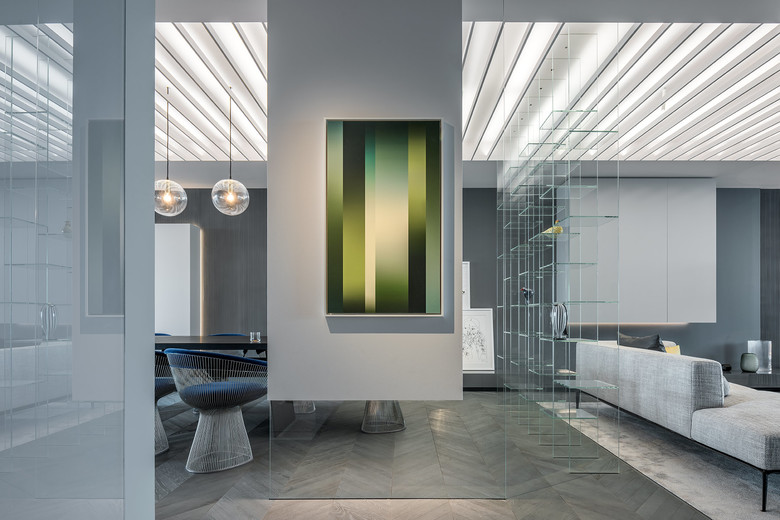 in the field above the lamella. They light up punctual and strong where light is needed; i.e. for art works, objects, shelves and kitchen work areas. The use of indirect light was a focal element in the lighting design, to enhance the transparencies and reflections of the interior design. Direct accent lighting plays together with soft glowing coves and gaps in order to compose a harmonic and distinguished living atmosphere. Well-aimed light objects and decorative luminaires complete the overall identity of the apartment. With a DALI light management system, pre-set scenes can be selected according to the individual needs of the owners.