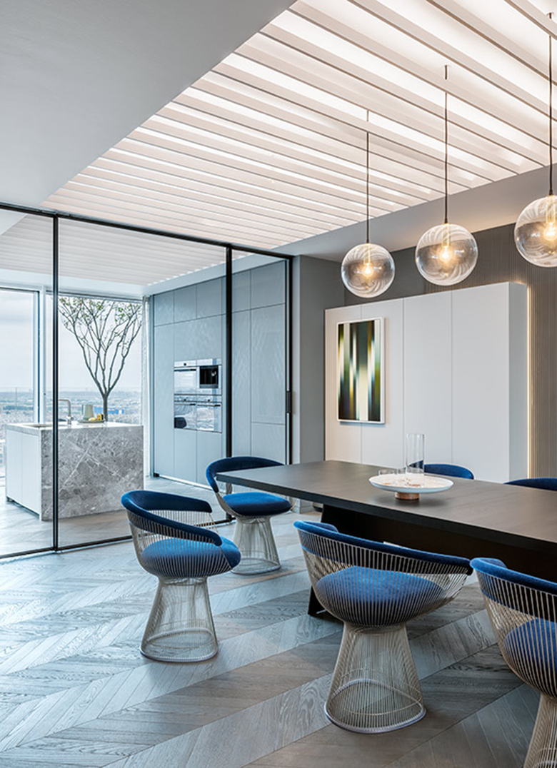Due to the central position of the apartment within the tower, and the resulting deep spatial dimensions, the lighting designers proposed a generous light field in the ceiling, referring to a huge skylight, adjustable to the various moods appearing during day and night. Integrated in the ceiling lamella, LED lines light up the ceiling above and create a soft overall lighting mood, enhancing the height of the apartment. With the use of dimmable and tunable white technologies,