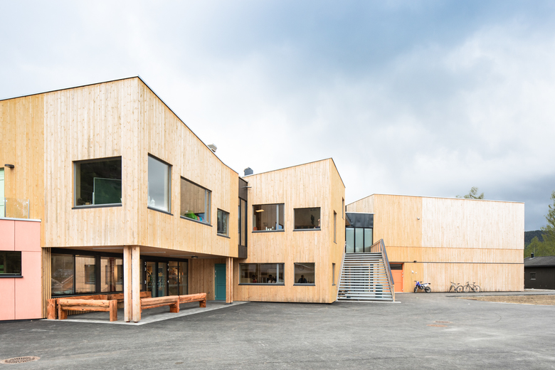 Eine kleine Gemeinde in der Region Telemark, im Süden Norwegens. Eine alte sanierungsbedürftige Schule mit althergebrachter Typologie: Flure, Klassenzimmer, Frontalunterricht. Anstatt diese Schule zu renovieren, entschied man sich in der Gemeinde Sauland für einen Neubau, der den Anforderungen des 21.Jahrhunderts entspricht. Freies Lernen und projektorientierter Unterricht stehen dabei im Vordergrund, Frontalunterricht wird auf das sinnvolle Maß beschränkt. Es war für das Dorf das größte Neubauprojekt seit 20 Jahren.