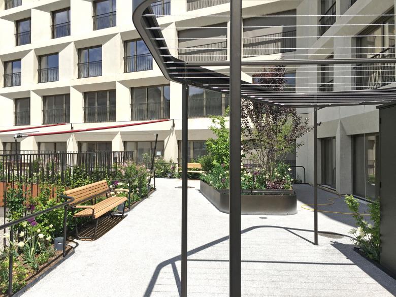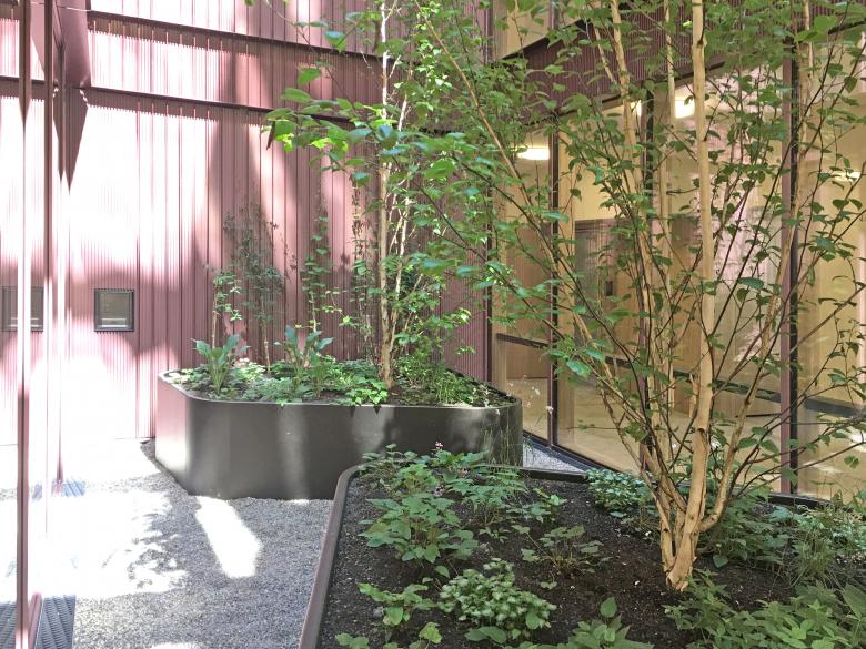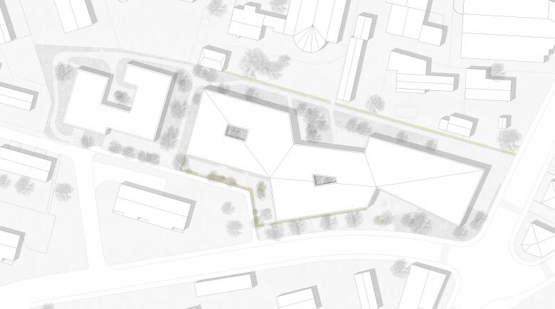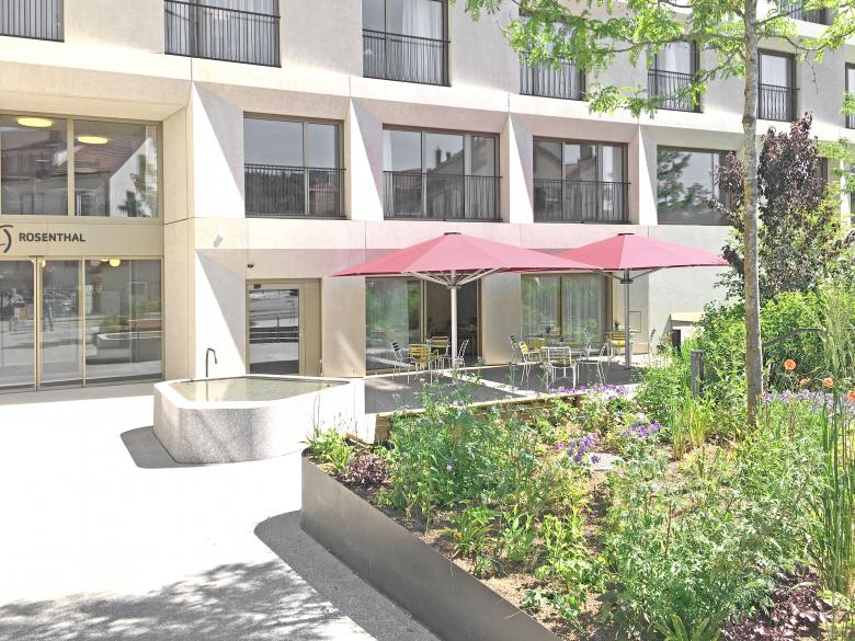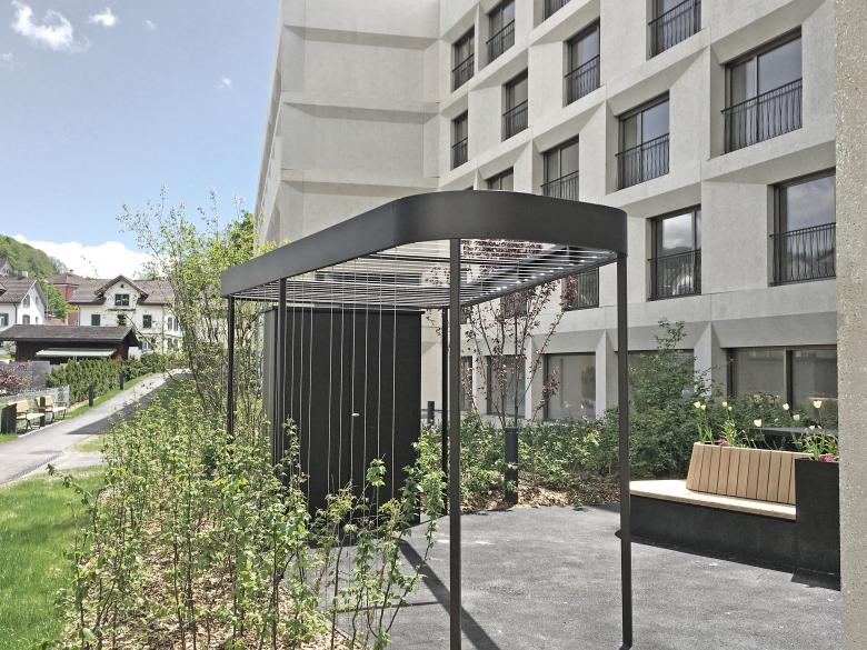 Das Projekt `Bonbon` für das neue Alters- und Pflegezentrum in Wald ging als Siegerprojekt aus einem Wettbewerb hervor. Das neue Alterszentrum Drei Tannen ist volumetrisch in drei Teile gegliedert. Die gestaffelte Gebäudeform reagiert in differenzierter Weise auf die variierenden Massstäbe und ortsbaulichen Ausrichtungen der Umgebung und erzeugt eine Vielzahl an unterschiedlichen Aussenräumen. An der Ecke Laupen- und Rosenthalstrasse wird in Bezug zum Felsenauareal eine prägnante Eingangssituation geschaffen, gegen Norden unterstreicht der Gebäudeeinschnitt die Nähe zur Kirche, und der Dementengarten liegt südwestlich in einer Nische. Im Dialog zur Topografie des Grundstücks schafft die zur Gebäudemitte hin sanft ansteigende Dachform einen subtilen Bezug zur umliegenden Hügellandschaft. Die Haupterschliessung des Alterszentrums erfolgt auf der Südseite von der Rosenthalstrasse her. Ein grosser platzartiger Bereich markiert die Eingangssituation. Die grosszügige Pflanzeninsel mit Sitzbank und ein langgezogenes Wasserbecken sind die prägenden Ausstattungselemente. Der Bistro-Aussensitzplatz sorgt für zusätzliche Belebung und die grossen Fensterflächen lassen vom Gebäudeinnern das Geschehen auf dem Platz mitverfolgen. Ein weiterer Aussenbereich, welcher vom Speisesaal her zugänglich ist, lädt auch an heissen Sommertagen zum Verweilen im Freien ein und gibt einen hübschen Blick frei zur gegenüberliegenden Kirche. Die im Erdgeschoss liegende Aktivierung erhält ebenfalls einen direkten Zugang zum Aussenraum. Einzelne Therapieangebote können so problemlos im Freien durchgeführt werden. Zwei Lichthöfe mit blühenden immergrünen Gehölzen und Staudenflächen werten den Innenbereich zusätzlich auf. Das durchgehende Fusswegnetz ermöglicht den Bewohnern eine schnelle Anbindung an das Dorfzentrum Wald. Das Parkplatzangebot in der neuen Tiefgarage und die Aussenparkplätze sind für Personal und Besucher von der Rosenthalstrasse her zugänglich. Einheimische Heckenkörper und Solitärbäume trennen die Aussenparkplätze vom Gebäude. Der Sinnesgarten für Demenzkranke erstreckt sich entlang der Südfassade des Alterszentrums und ist vom geschützten Wohnbereich ebenerdig zugänglich. Von aussen kaum einsehbar bildet er einen wind- und sonnengeschützten Aufenthalts- und Therapiebereich für die demenzkranken Bewohner. Duft- und Kräuterpflanzen, Hochbeete, ein barrierefreies Wegesystem, Handläufe, eine lauschige, schattenspendende Pergola, ein plätschernder Brunnen, einheimische Blütengehölze und Staudenpflanzungen ergeben eine sinnliche und wohlige Atmosphäre.
