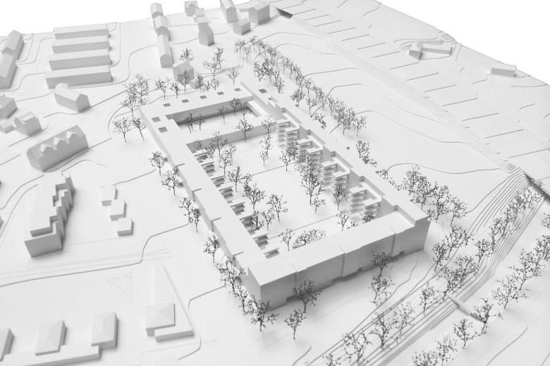 Umgeben von Autobahn und Autobahnzubringer, sogenannten transitorischen Funktionsorten, soll auf dem vom Siedlungsraum isolierten Acker ein Ort mit individueller und kollektiver Identität geschaffen werden. Ein neuer Wohnort mit einer signifikanten Prägung. Im Zentrum der Anlage liegt der Park: Ein vom Lärm der Aussenwelt abgeschirmter Hofraum, in dem der umlaufende Baumkranz auf das Parkinnere verweist und vor Ein- und Ausblicken schützt. In der Auseinandersetzung mit den schwierigen Randbedingung für ein hochwertiges Wohn- und Lebensgebiet wurde eine Form entwickelt, die für einen ganz besonderen Ort steht.