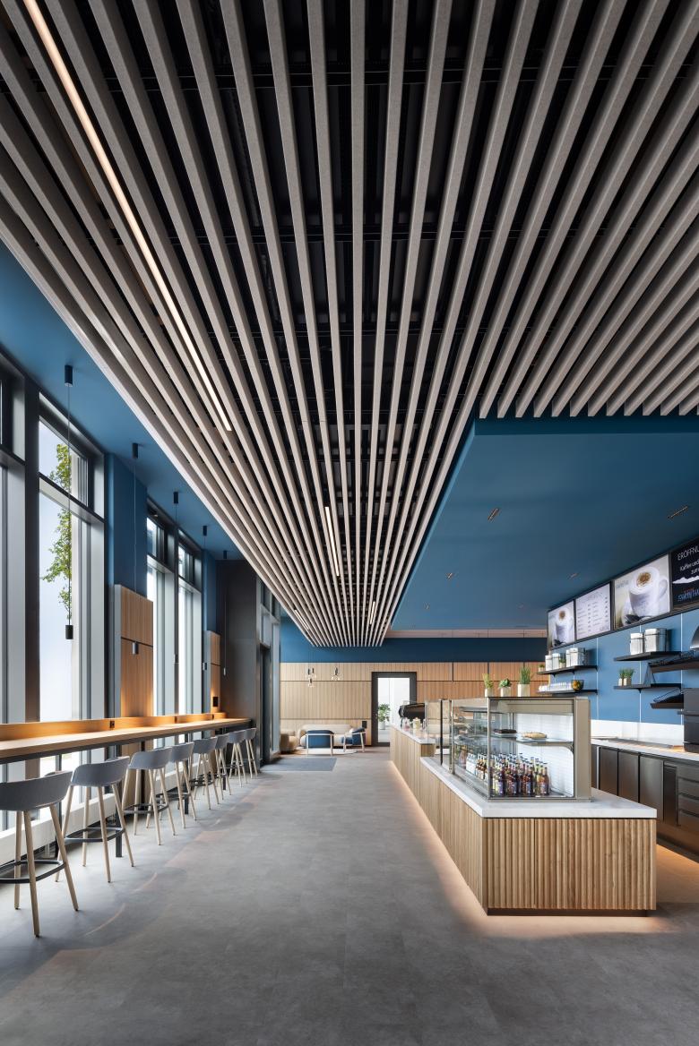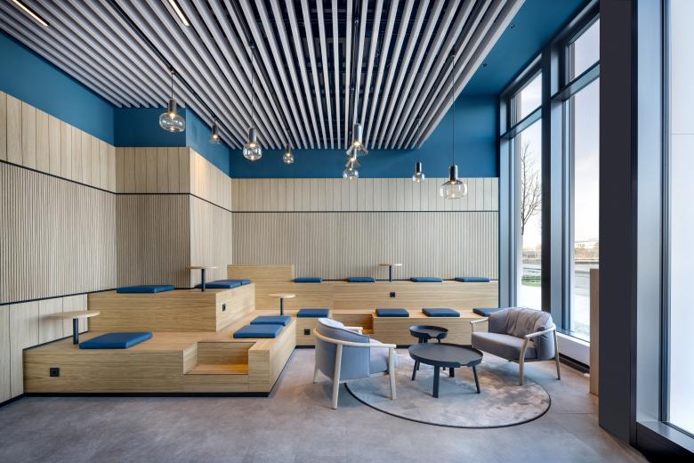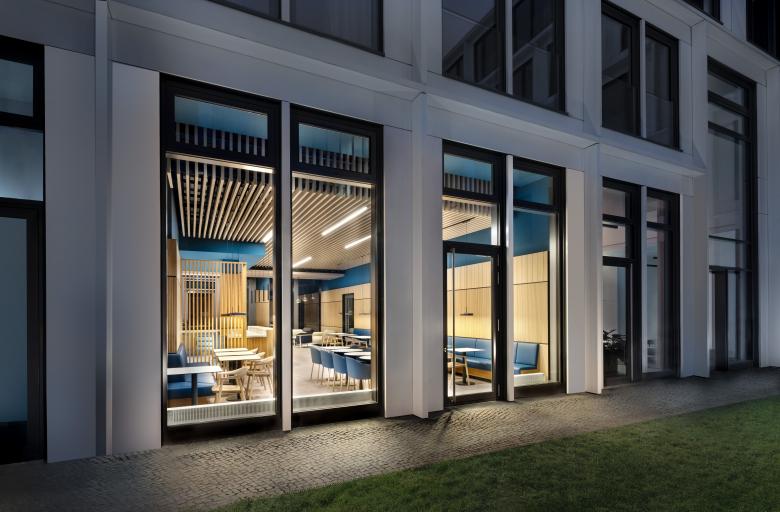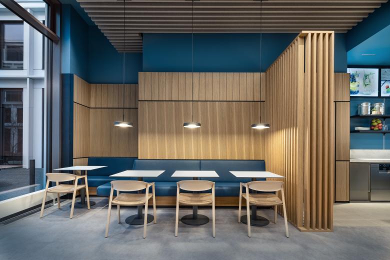 Measuring around 250 square metres, the bistro is a publicly accessible hybrid social space that combines function and atmosphere, companionship and quiet relaxation – a prime example of a new work culture that puts people and their needs centre stage. The project was designed not as a closed office space but rather as an integrative part of a larger urban framework and reflects how the working world is shifting more towards a greater sense of purpose, flexibility and community.
