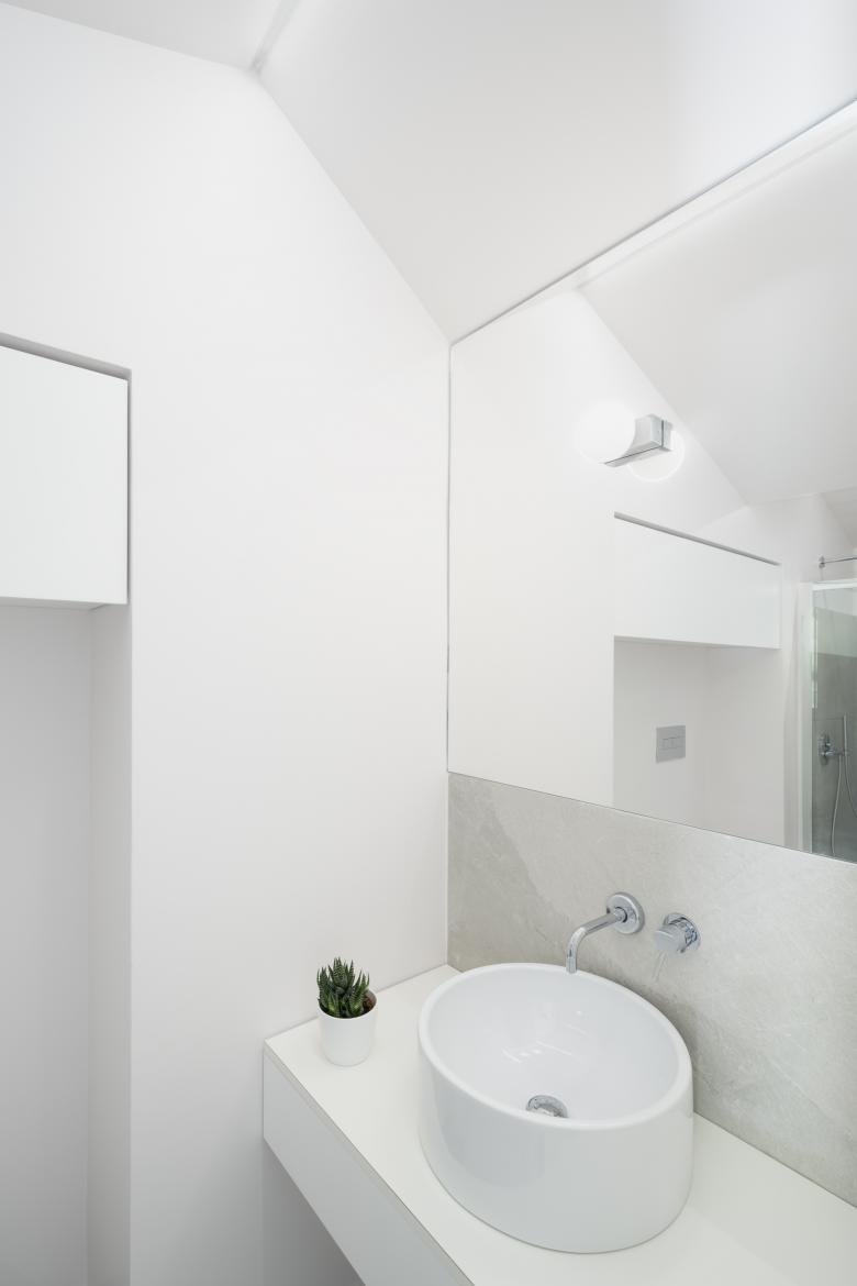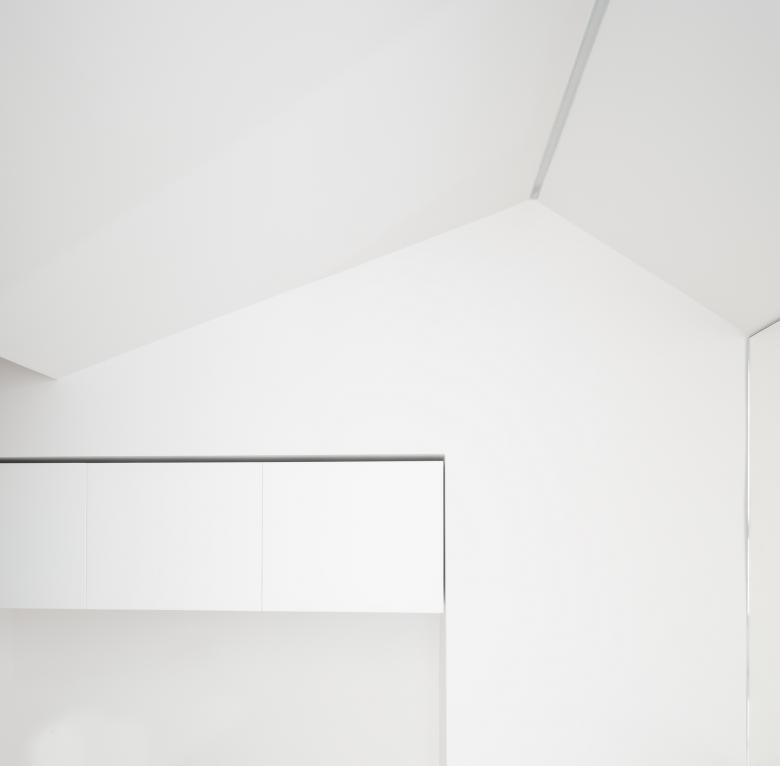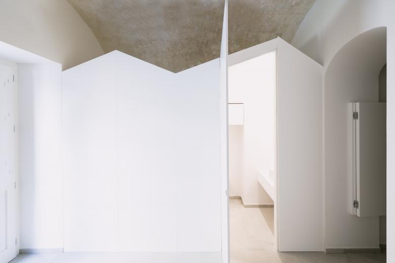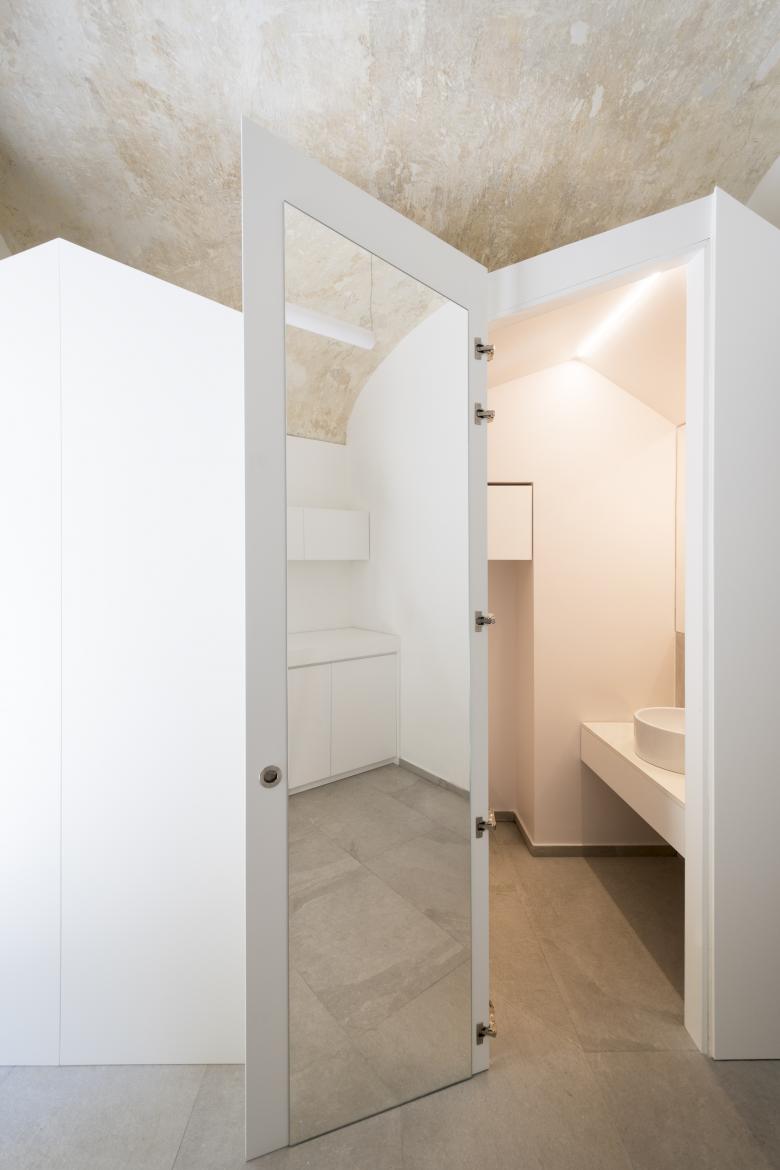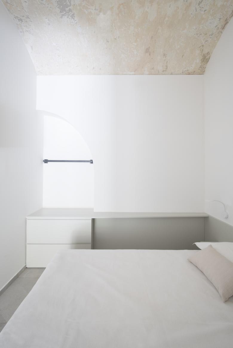 Un unico sistema nella zona notte, integra: letto, scrittoio e ripiani, è un velo. I materiali sono pochi e semplici: gres a grande formato per i pavimenti e i rivestimenti, legno laccato bianco per gli arredi su misura.