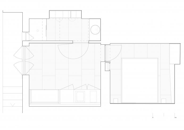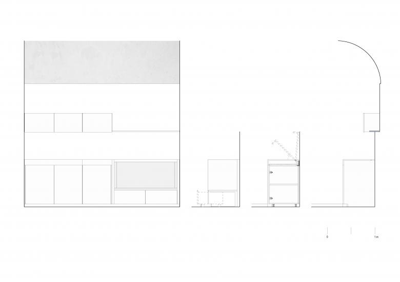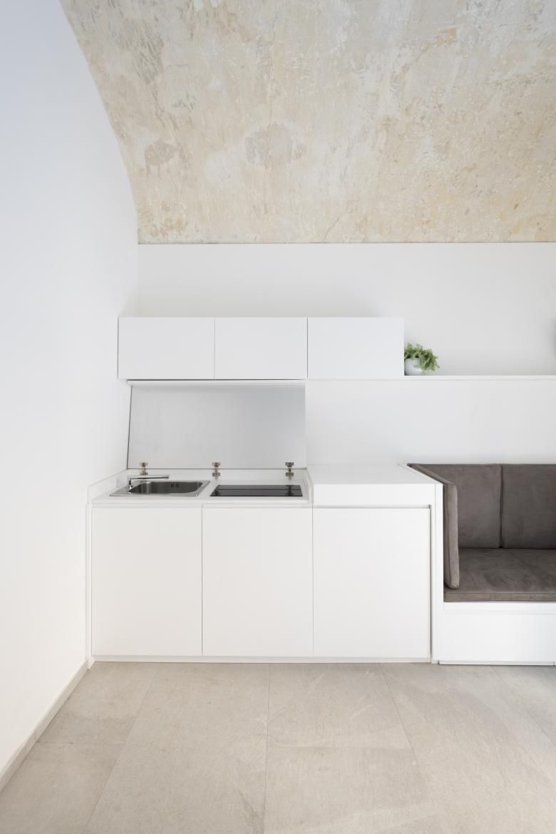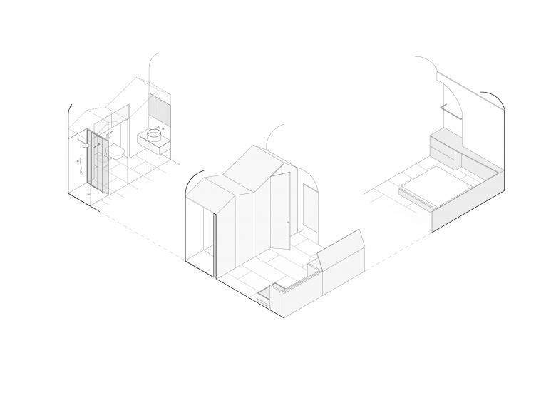 Progettare una casa di soli 26 m² è stata l’occasione per confrontarsi con il tema della “dimensione minima dell’abitare”: l’existenz minimum. Ottimizzare lo spazio in base alle esigenze richieste rappresenta una condizione normativa necessaria, disegnando ogni parte sartorialmente. L’ambiente principale della casa, si caratterizza attraverso la contrapposizione di forme date e generate: Il soffitto a botte esistente viene riportato a rustico e si contrappone alle falde spigolose del nuovo volume rivestito in legno che contiene il bagno, un parallelepipedo, invece integra il mobile cucina (apribile all’occasione) con un piccolo divano.
