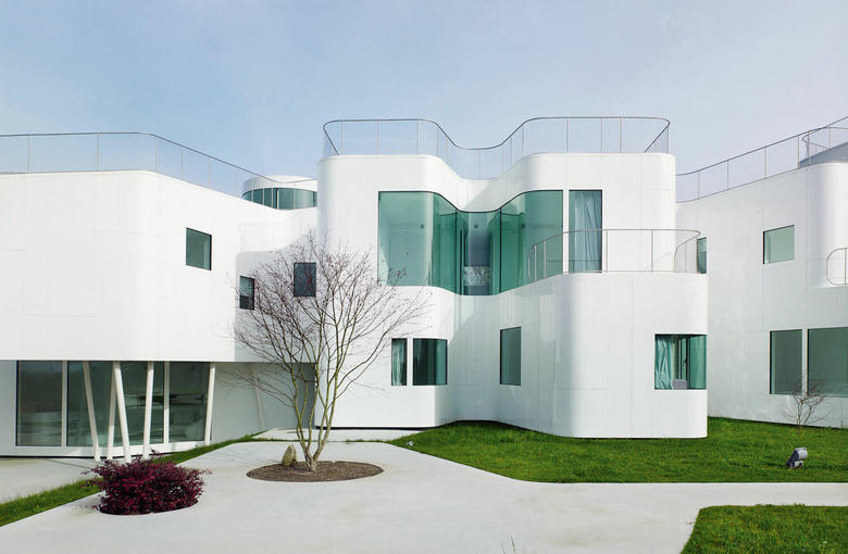 Pese a su gran tamaño, la llamativa fachada blanca de chapa metálica reflectante y los grandes ventanales parcialmente curvados del piso al techo transforman esta casa de vacaciones en una escultura viva.