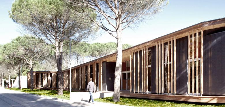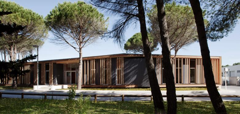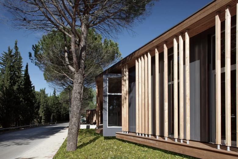 The project proposes a stake in retreat of the glazed facades and the implementation of wooden canopies connecting the high and low entities of the fold. This device creates a thick façade, protecting from the sun, while allowing taking advantage of a direct connection between the inside and the outside thanks to wide openings. The device also allows a spatial and visual continuity while answering the Mediterranean climatic constraints. The project is completely wooden built. It is an environmental choice which we made by working with local essences of pines, but also in order to assure a technical, constructive and functional simplicity.
