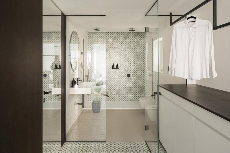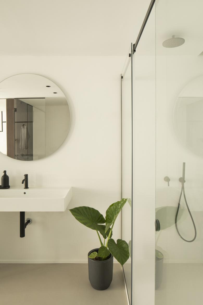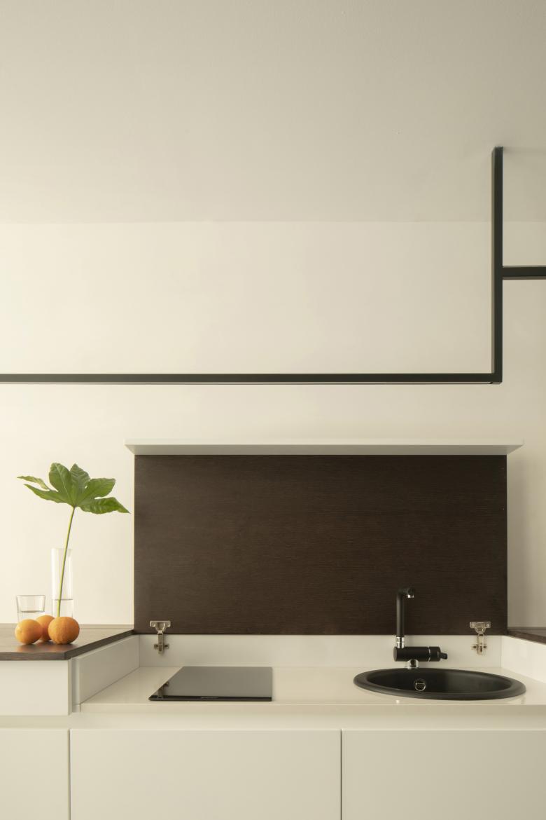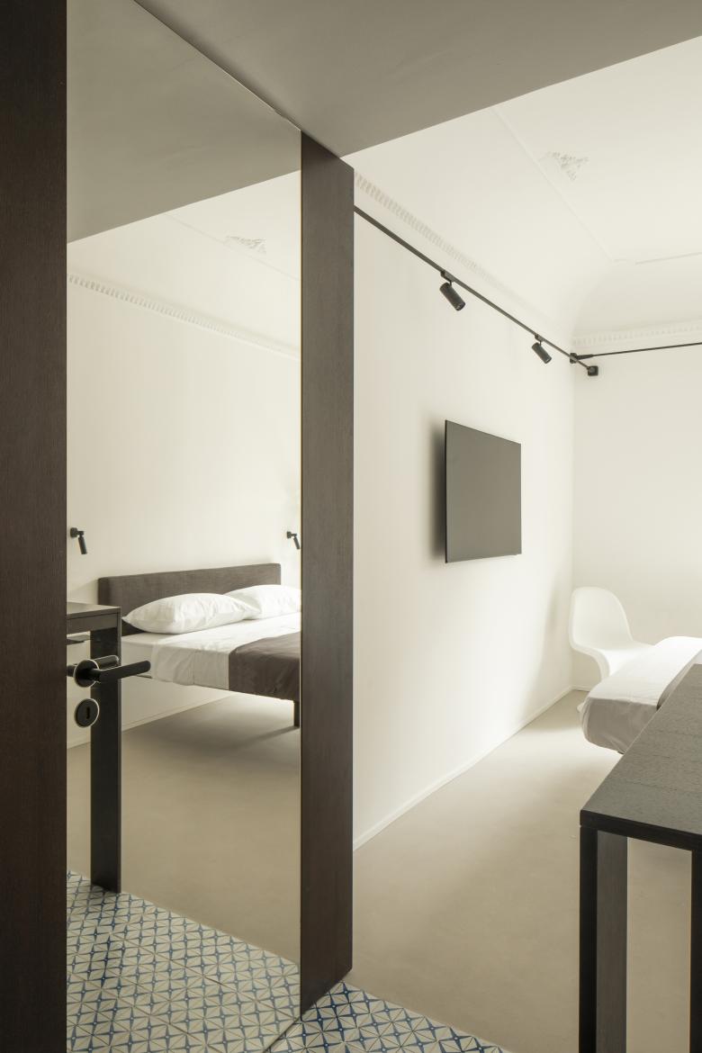 In questa cornice storica, si inserisce il progetto di conversione di un piccolo immobile in attività ricettiva, componendo due suites dal carattere contemporaneo, ricercando allo stesso tempo un linguaggio attento alla tradizione locale. Lo spazio delle camere si sviluppa su una superficie di 28 metri quadri, la pianta si articola in profondità suddividendo tre zone: La parte centrale e d’ingresso, funge da filtro fra la zona notte e la camera bagno, amplificato da un cambio di pavimentazione fra resina e maiolica realizzata appositamente da artigiani di Santo Stefano di Camastra. Lo spazio centrale si articola inoltre, attraverso l’inserimento di un sistema su misura in legno, contenente una piccola cucina a scomparsa, lo insegue un elemento sospeso che illumina il piano e funge inoltre da appenderia. La zona notte disposta a capo delle camere, guarda la piazza e la chiesa, qui vengono recuperati i soffitti a padiglione caratterizzati da decori in gesso, sullo sfondo invece la camera bagno, suddivisa dal resto da una parete in vetro trasparente che conferisce profondità e ampiezza, ricercando una relazione di continuità visiva con il resto dell’ambiente.