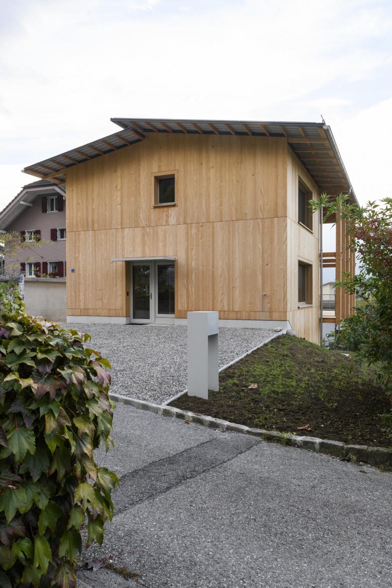 Der Ersatzbau übernimmt die Ausrichtung des bestehenden Einfamilienhauses, das komplett abgebrochen wird. Der Neubau erfolgt im holzpur-System, das auf Metall, Leim und chemische Baustoffe verzichtet.