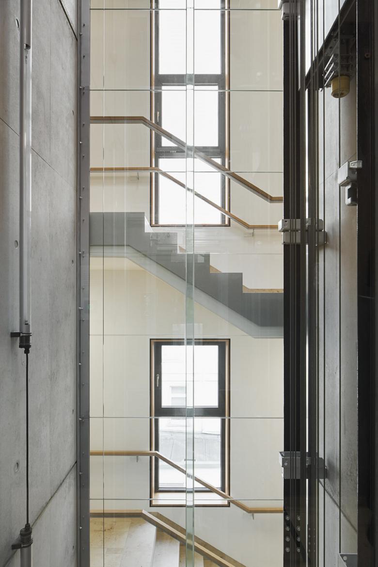 Durch die weiße Betonfassade, die aus geschosshohen Faserbetonelementen besteht, erhält das Gebäude das nötige Gewicht um die unterschiedlichen Fassaden entlang der Kaiserstraße zusammenzubinden und zu fassen. Die elegante Steinfassade des Bestandes aus den 50ern mit seiner vertikalen Gliederung diente als Vorbild. Zusammen mit diesem Bestand bildet die neue Fassade einen Rahmen für die dazwischenliegende Glasfassade mit ihren tiefstehenden Pfosten aus eloxiertem Aluminium. Beherrschend in der neuen Ansicht sind die stehenden Formate, die dem Bau seine zeitlose Eleganz verleihen. Mit durchlaufenden Pfeilern werden in einigen Bereichen 2 Geschosse zusammengefasst. Die Fassade erhält dadurch eine zusätzliche Gliederung. Die Einschnitte entlang der Hirschstraße markieren besondere Punkte, zum einen die Durchfahrt in den Hof, zum andern die Einleitung in die Kaiserstraße. Durch den Einschnitt an dieser Stelle wird der Kopf ausgebildet und turmartig erhöht. In der verkürzten Perspektive der engen Hirschstraße ziehen sich die schmalen vertikalen Formate der Betonfassade zu einer wandartigen Struktur zusammen, in denen goldschimmernden Flächen eingearbeitet sind, die sich aus den tiefstehenden eloxierten Aluminiumpfosten zusammensetzen. Nach oben lösen sich die Pfosten auf und schweben wie eine Krone über dem Bau.