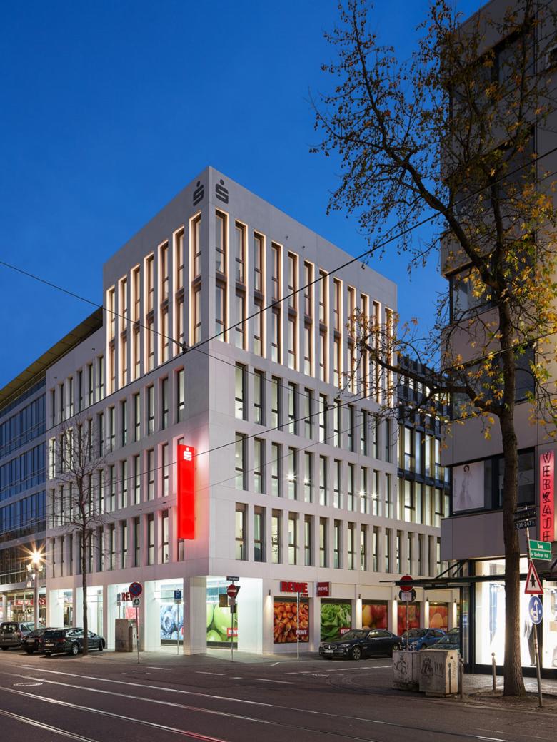 Der Hauptsitz der Sparkasse Karlsruhe Ettlingen liegt im Herzen von Karlsruhe direkt an der Kaiserstraße und nimmt fast einen gesamten Block ein. Das neue Verwaltungsgebäude liegt an der östlichen Ecke des Blocks und schließt die unterschiedlichen Fassaden entlang der Kaiserstraße mit einer turmartigen Erhöhung ab. Der Turm markiert die Ecke und leitet in Hirschstraße ein, die an dieser Stelle die Kaiserstraße kreuzt. Über 90 m erstreckt sich das neue Gebäude in die Hirschstraße. Es ersetzt die 3 Bestandgebäude und integriert im Erdgeschoss den Supermarkt.