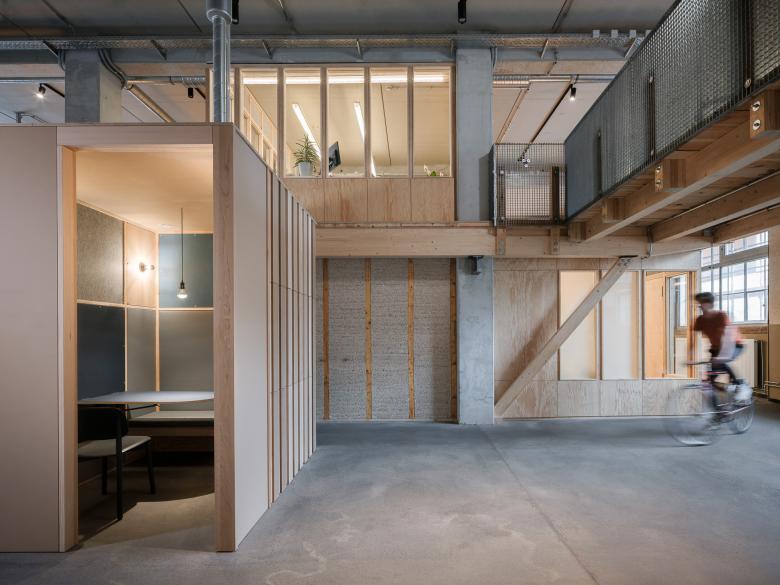 In the open-plan and private offices on the ground floor, the combination of direct and indirect lighting ensures bright, pleasant workspaces. The lighting supports working with a uniform, bright and glare-free ambience. The lighting solution consists of "light hacks" - this is what Studio De Schutter calls price-optimised semi-bespoke luminaires that were created from standard elements and simultaneously respond to individual project requirements. The linear lighting consists of reclaimed wooden boards, LED light strips for indirect lighting and diffuse light tubes that have been combined to create pendant luminaires. To minimise glare (UGR) from the diffuse LED linear luminaires, this "light hack" was wrapped with fabric. Samples and mock-ups were used to test various perforated materials to optimise the light output and examine the energy consumption. In the end, an industrial fabric made of non-flammable material was used.