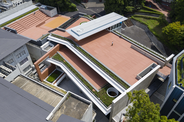 The new plan was precisely, to transform this retaining wall as an architecture with its rooftop turned into an aerial garden. This sky garden thus connected the second floor of the campus building to the south and the rooftop of the gallery building to the north. At the same time, a new plaza was to be created on the green slope of the campus site. On top of that, the major objective was to connect the vertical human flow, which had been disconnected before by the old retaining wall.