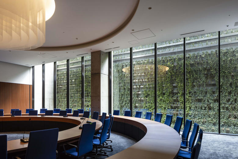Furthermore, the steps leading from the lower floors up to the higher floors are placed along the vertical wall, connecting the 4 floors of interior spaces, and is made of the brown brick tiles, so closely reminiscent of those of the old “Boutenkan”. This one, direct staircase leads with unobstructed upward view, to experience the brick façade and the presence of the soaring retaining wall, which are, of course, the two elements to be remembered from the old ”Boutenkan” in this exact location.