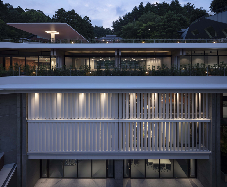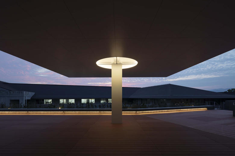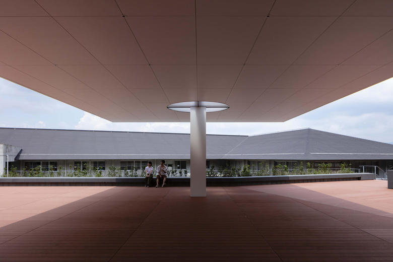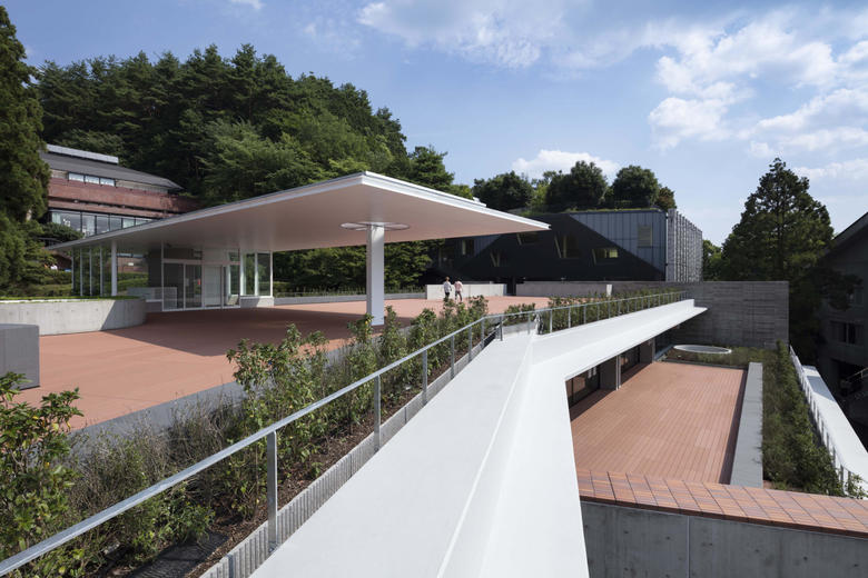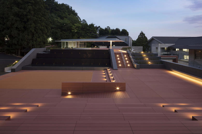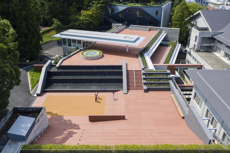 The approach from below is designed to lead up to the maximum space possible, wide open to the sky, by setting back the top floor of the building. In addition, the top floor of the gallery building is revived as a wide open space, and at the same time, is connected one floor up to the rooftop plaza with a staircase and a waterfall. The rooftop plaza is now an aerial garden of extensive, horizontal dimension which never existed before in this campus.