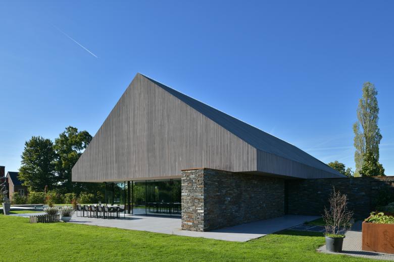The roof is totally covered with wood and contains the night spaces. The wood cladding integrates all the architectural elements (cornices, chimney pipe, etc). The terraces are carefully integrated into the mass.