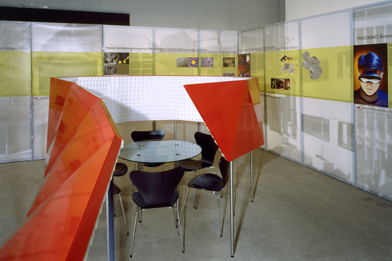 Die zu präsentierende Information ist direkt auf die Bespannung gedruckt und wird von jeweils acht am Regalprofil befestigten Glühbirnen hinterleuchtet. Dadurch werden alle drei Wände des Messestandes gleichmäßig ausgeleuchtet und eine gute Lesbarkeit erreicht. Die Regale sind von den den Messestand begrenzenden Paneelwänden abgerückt (seitlich 0.6 m, hinten 1.6 m), so dass Funktionen wie Stauraum, Kleinküche, Aufenthaltsbereich, Garderobe und ein umlaufender Servicegang an der Rückseite hier Platz finden.