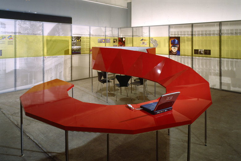Das Regalsystem ist über den Servicegang von hinten zugänglich und kann Monitore, Computer und Exponate aufnehmen. In die backlight-Folien können je nach Anforderung und Größe der Exponate, Monitore etc. Öffnungen geschnitten werden. Die Präsentationswände können im Raster von 1.0 m nahezu beliebig angeordnet werden und gehen dadurch auf unterschiedliche Raumsituationen und Größen ein. Die backlight-Bahnen werden mittels Klettverschlüsse am Regal befestigt.