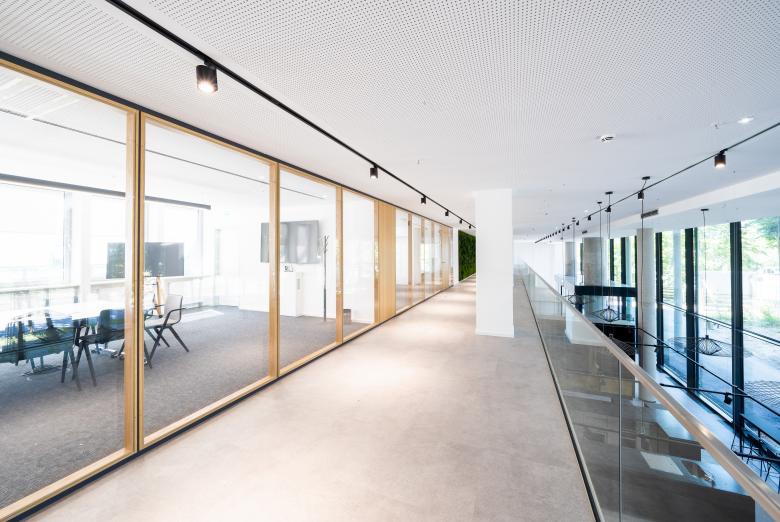 Im Zuge der Revitalisierung des Ende der 1990er Jahre entstandenen Olympia Business Centers (OBC) und dem Wechsel von einem einzigen Mieter zu mehreren wurde ein neues Raumkonzept für den Gebäudekomplex erforderlich. Der Bestand wurde um einen zweigeschossigen Bau als Eingangsbereich ergänzt, der das Gebäude mit großen Glasflächen zum Ring hin öffnet und gleichzeitig eine Verbindung zu den weitreichenden Grünflächen im Außenbereich schafft. Im Foyer und dem angrenzenden neu entstandenen Kantinenbereich entsteht so eine helle und freundliche Atmosphäre. Bei der Neustrukturierung des Arbeitsumfeldes führte unser Team nicht nur den umweltbewussten Kerngedanken einer Revitalisierung durch den konsequenten Einsatz von nachhaltigen Materialien weiter. Es entwickelte sein Raumkonzept auf Basis der Nutzerbedarfe und kreierte so flexible und kommunikative Gemeinschaftsbereiche, die den Austausch der Mieter untereinander fördern und Orte für Innovation schaffen. Der Konferenzbereich im EG beispielsweise kann von allen gebucht werden, ebenso die Flächen des Restaurants, das nicht nur als Kantine konzipiert ist, sondern auch für Events und Besprechungen genutzt werden kann. Für privatere Gespräche und stilles Arbeiten kann man sich dort in kleinere Boost-Einheiten zurückziehen. Neue Grünanlagen und mehrere gemeinschaftlich nutzbare Dachterrassen schaffen zusätzlich Aufenthaltsbereiche, die das Miteinander fördern.