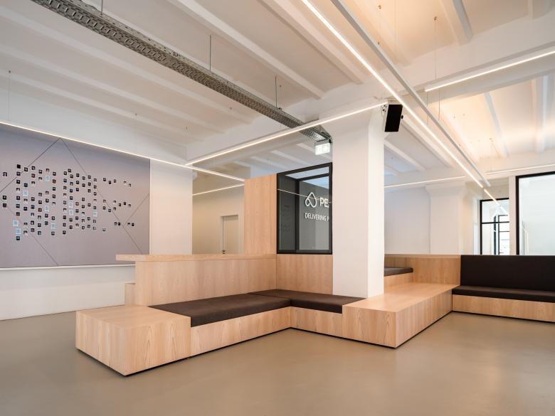 The special ceiling construction as well as the uneven walls and ceilings of the old building were a challenge for the execution and planning of the lighting, which was solved by a flexible luminaire system, precise coordination of the mounting points and the cutting of the indirect cover on site. The versatile use of work areas through to customer receptions and events also presented exciting challenges. The solution is a fully controllable lighting solution that can change areas and atmosphere at the touch of a button using pre-programmed scenes.