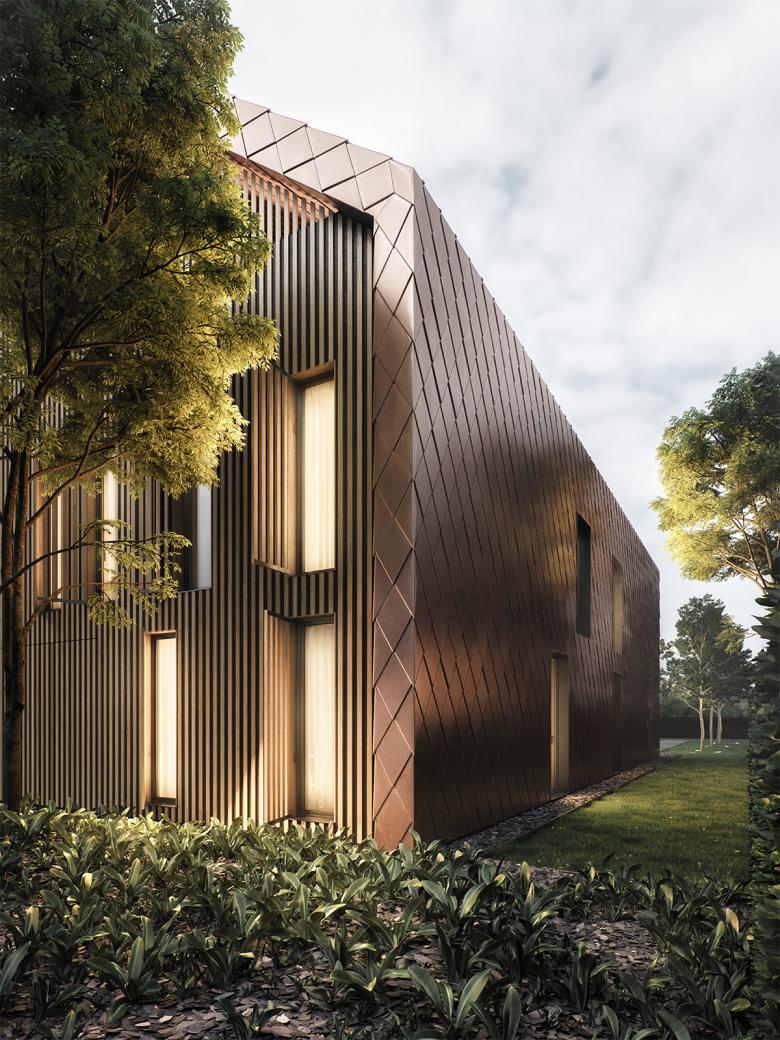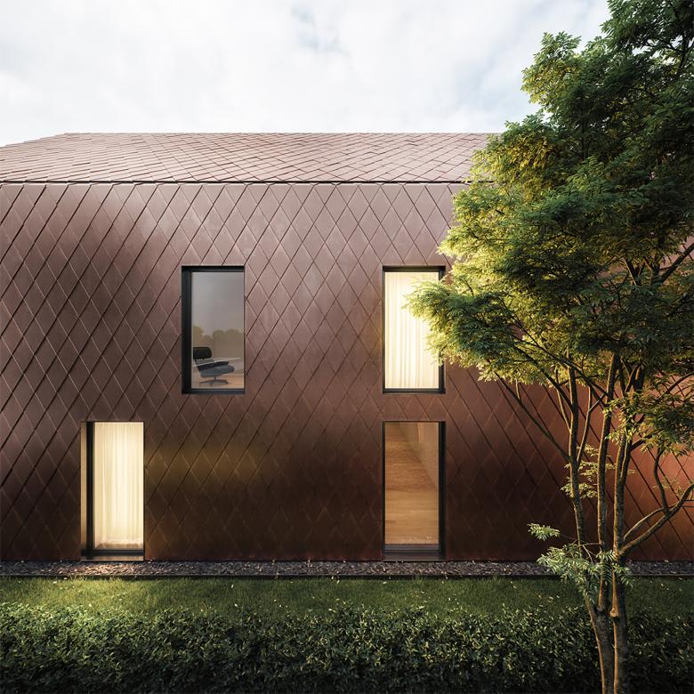 The facade made from bronze shingles runs over the roof, thus emphasizing the reduced volume and encompassing the entire building.
