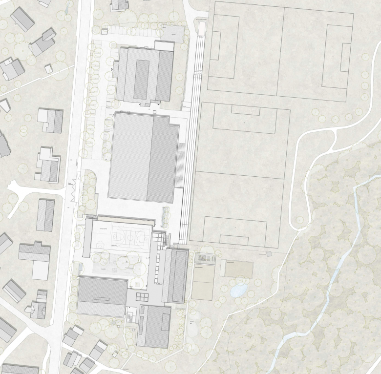 Der Neubau bedingt, dass der Spielplatz auf der Ostseite der bestehenden Schulhäuser neu platziert wird. Dies erweist sich als Mehrwert: so können der ergänzte Sport- und Spielbereich sowie der Spielplatz kompakt organsiert und für die Öffentlichkeit besser erreicht werden.