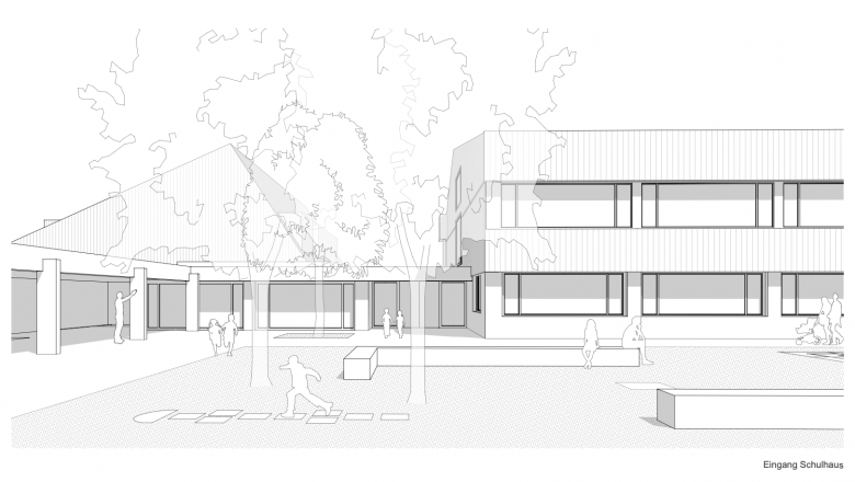 Durch die Positionierung des neuen Schulhauses wird der bestehende Pausenplatz neu von drei Seiten gefasst. Durch die Klärung des Zugangs und durch die Neupositionierung der Velodächer entlang der Buchenstrasse entsteht ein klarer Ankunftsort auf dem Hof. Als bestehende Elemente werden die Pflanztröge mit den vorhandenen Gehölzen beibehalten und mit neuen, standortgerechten Arten angereichert. Sitzelemente, ein Trinkbrunnen und Spielfelder erhöhen die Aufenthaltsqualität auf dem neu gestalteten Pausenplatz.