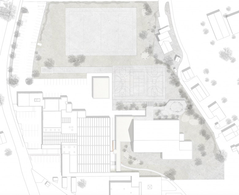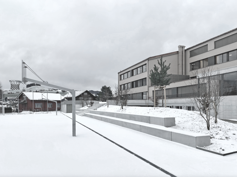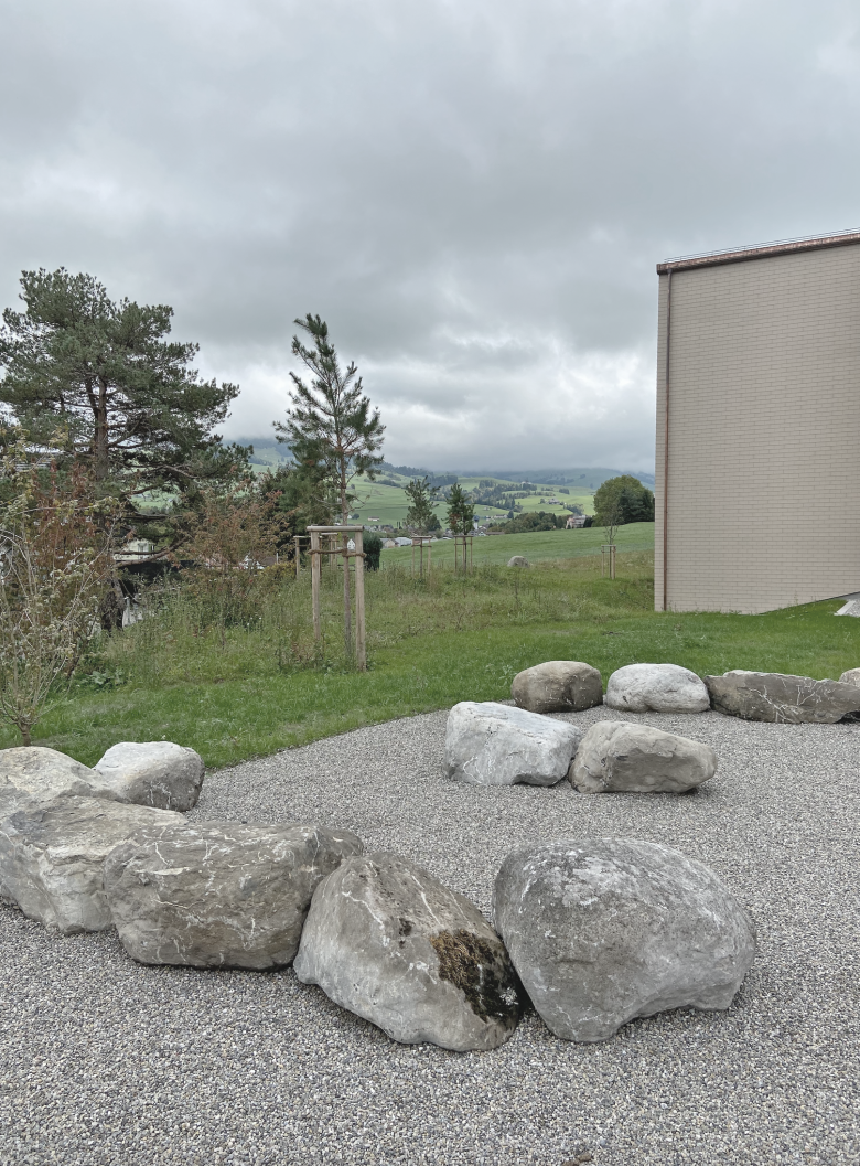 Komplettiert wird die Schulanlage mit diversen Pausen- und Freiflächen welche das gesellige Beisammen sein, aber auch Rückzugsorte für die Schulkinder ermöglichen. Die teilweise kreisrund angeordneten Findlinge bieten sich zudem als Aussenschulzimmer an.