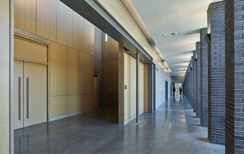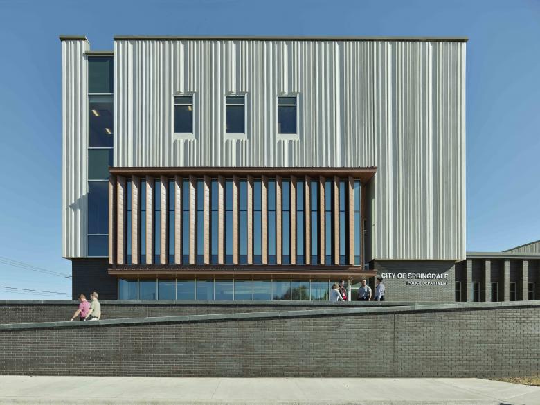 The City of Springdale has limited and finite resources for building and maintenance of the project. The programming planned for and included space for 20 years of growth in the project. The design solution had to be economical and exhibit both long-term flexibility for office areas and durability for public use areas. The exterior combined brick and precast concrete skin. The precast panels are shaped to be an active light and shallow changing surface. The goal is to utilize an inexpensive material and achieve civic presence with a dynamic pattern of light and warm and cool shadows. Interior materials include ground-face concrete block walls, polished concrete floors, and exposed painted steel. The three civic rooms; the council chamber, the courtroom, and the police training room are each upgraded with natural light, a view of the park and city, and adorned with acoustic wood paneling and oak-trimmed steel trusses.