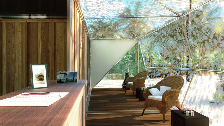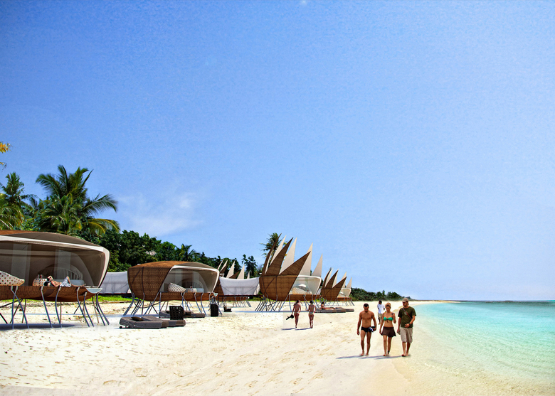 ... upon arrival, while walking through a meandering path between the beach and the rain-forest, watchs their room "open" to shelter them...