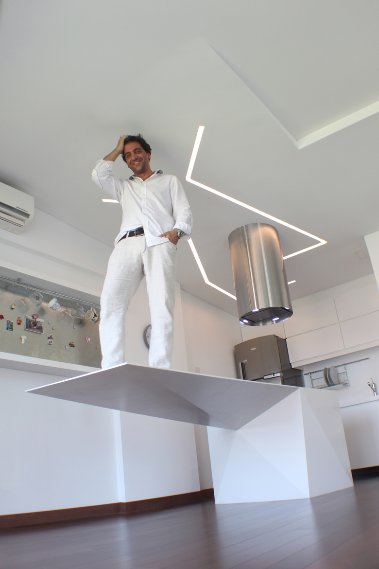 The decision was to make a single floating piece with a leading role organizing the lower plan. Special attention was paid to details and measures so when standing no matter from where you are looking at you can only see a 3mm thick table however when seating in the living area you can perceive the complexity in shapes and the strength of gravity playing an outstanding role.
