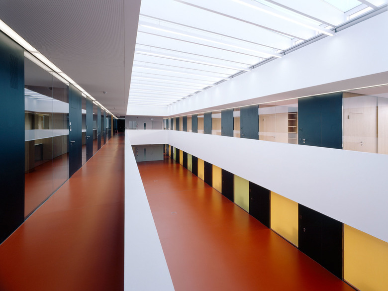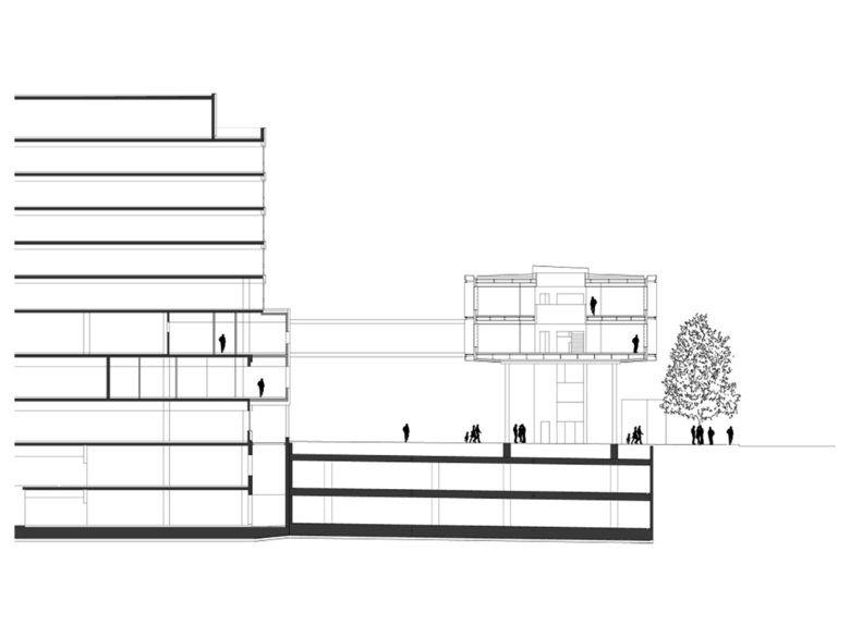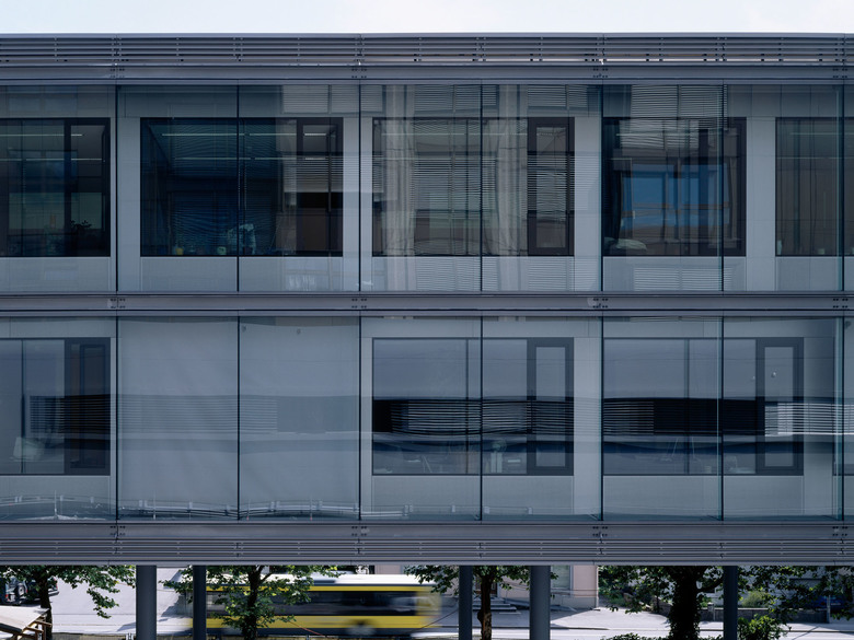 Die Dornbirner Westeinfahrt trifft beim Krankenhaus auf die zentrale Stadtstrasse: das Spital ist ein Signalbau, abgerückt von der Lustenauer Straße stehend. Das Vorfeld wird nun für den Zubau eines Verwaltungstrakts genutzt. Der in Stahl konstruierte, mit Stahlbetonkernen ausgesteifte, hoch aufgeständerte Riegel steht parallel zum Haupthaus. Der Stützenraster der Tiefgarage wird übernommen. Die Büros gruppieren sich um eine zweigeschossige Halle. Die Glas-Metall-Fassade weist einen außen liegenden Sonnenschutz auf. Der Bestand wird umstrukturiert und in Weiterführung des Sockelgeschosses eine Intensivstation, Bereitschaftszimmer und die Ambulante Bettenstation ergänzt.