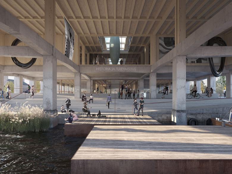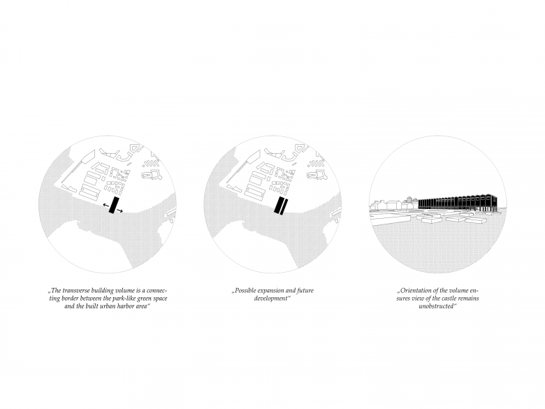 Das Wettbewerbsgebiet befindet sich in einer städtischen Zwischenzone, die als Bindeglied zwischen einer künftigen Grünfläche und der Hafenkulisse dient. Hier bilden Infrastrukturbauten und historische Wahrzeichen, darunter das Schloss, ein einzigartiges städtebauliches Gefüge. Die künftige Stadtentwicklung sieht eine Verdichtung der Umgebung mit einer vielseitigen Funktionsmischung vor. Als Antwort auf dieses sich entwickelnde Stadtpanorama entwickelt sich unser Projekt zu einem urbanen „Gelenk“, das darauf abzielt, die Vielfalt bestehender und künftiger Strukturen zu verbinden und kulturelle und funktionale Elemente zu verschmelzen.
