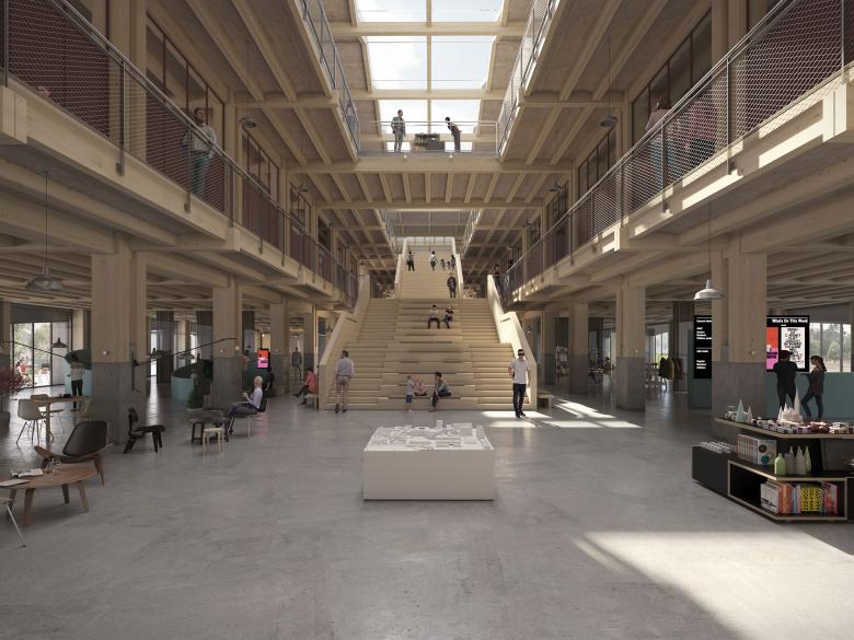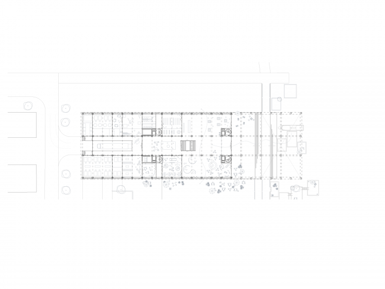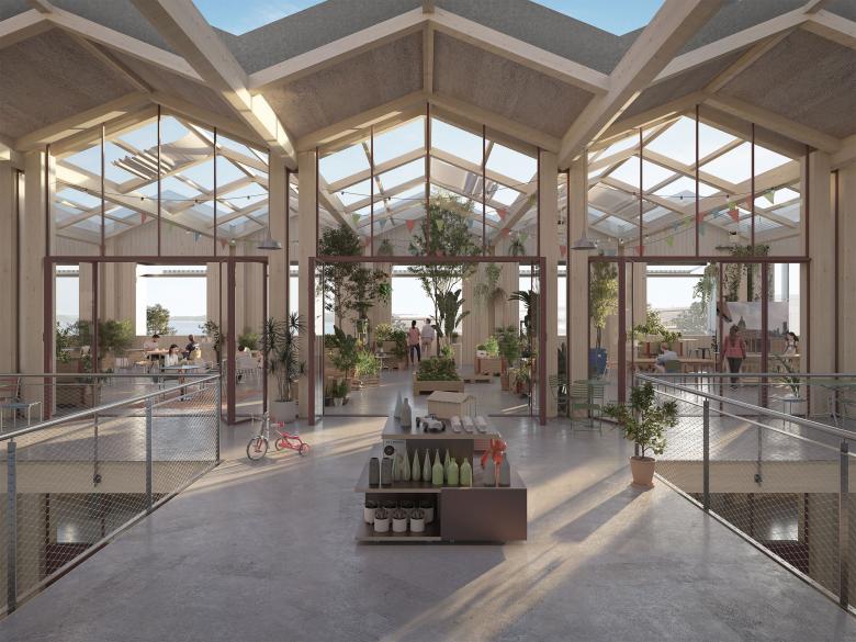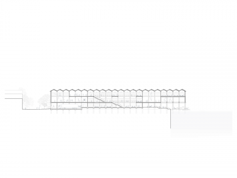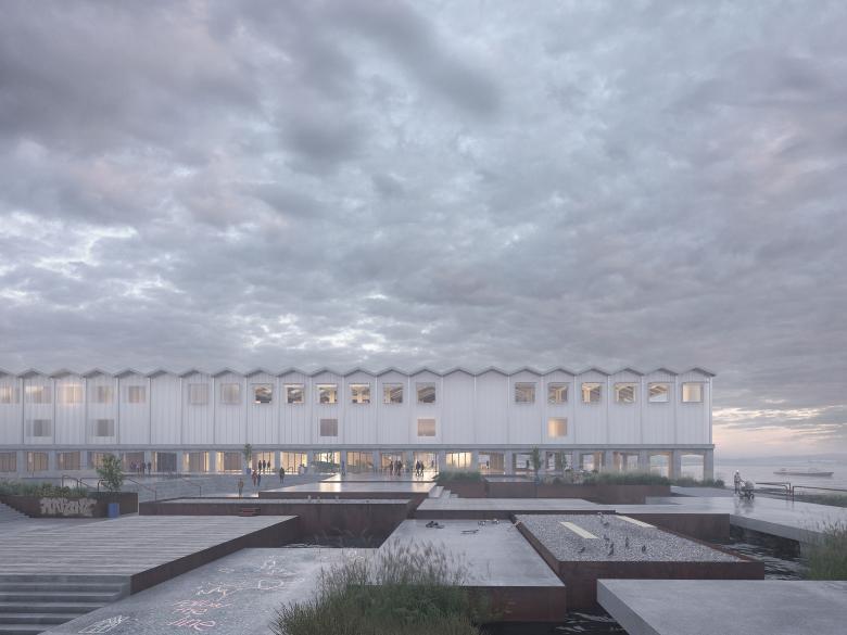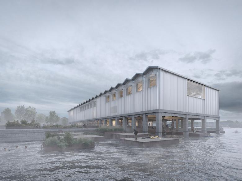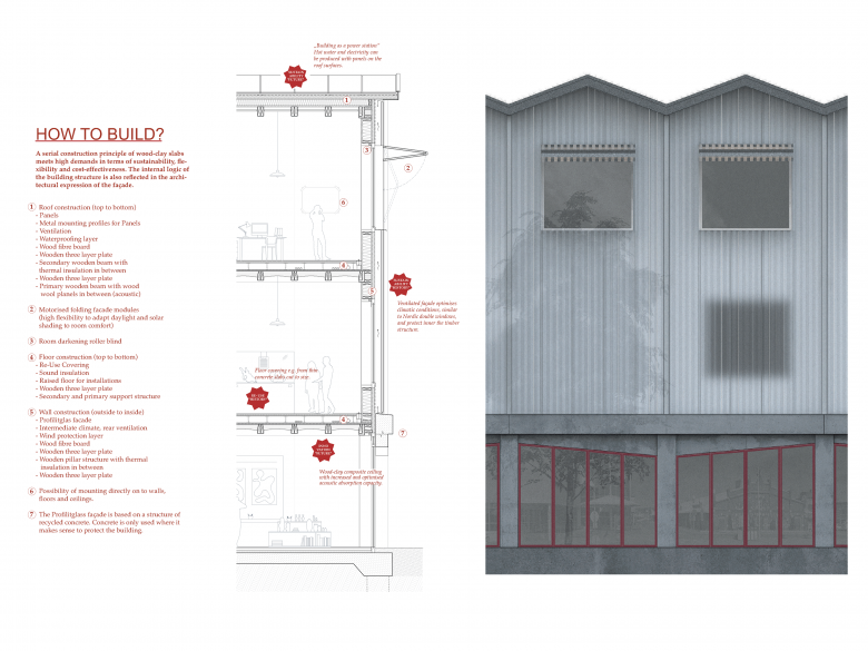 Der senkrecht zum Flussufer ausgerichtete Baukörper dient dabei als zentraler „Verbindungspunkt“ zwischen der parkähnlichen Grünfläche und dem neu zu entwickelnden städtischen Hafengebiet. Die langgestreckte Fassade verkörpert ein pragmatisches und rationales serielles Bausystem, das die industrielle Essenz der Hafenregion widerspiegelt. Die aneinandergereihte Holz- und Lehmbauweise wird durch eine industriell gefertigte Profilit-Glasschale abgeschirmt, die eine industrielle Ästhetik vermittelt, die dem Charakter des Viertels entspricht.