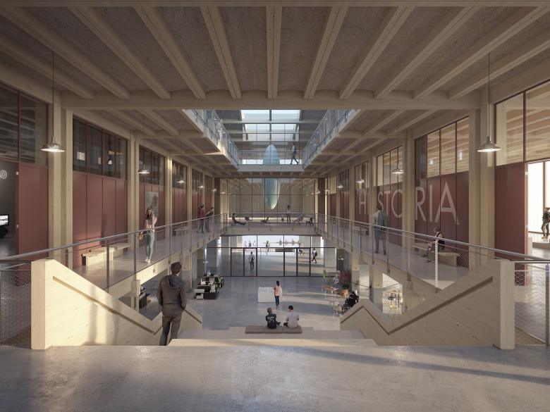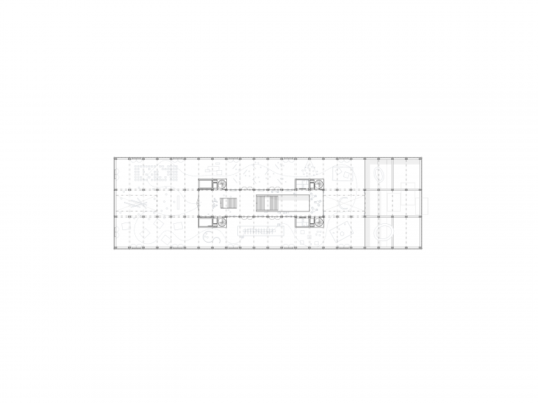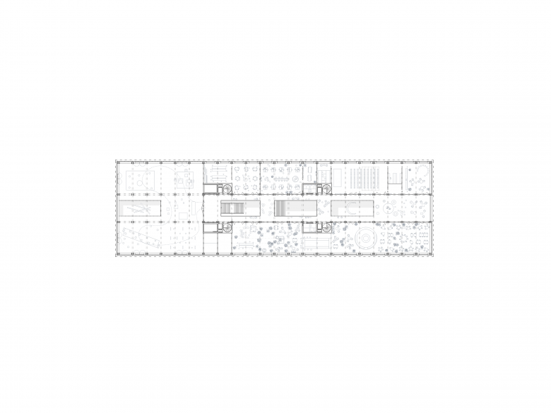 Das Museum ist eng in das städtische Gefüge integriert und wird als städtische Infrastruktur ähnlich wie andere Funktionen innerhalb von Gebäuden spürbar. Die räumliche Reise, die vom halbüberdachten Eingangsbereich über die „Innenprome-nade“ mit öffentlichen Plätzen und Ausstellungsräumen beginnt, gipfelt im „urbanen Lebensraum“ im obersten Stockwerk, der eine Reihe von öffentlichen Nutzungen bietet.