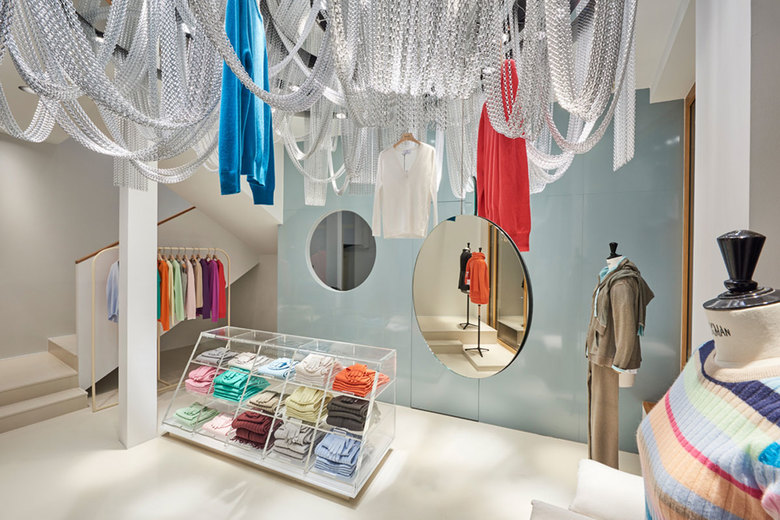 Ein Highlight ist die in die Decke integrierte Lichtketteninstallation: Lustvoll und fantasiereich interpretiert sie das feine Thema des Stricks in den neuen Räumen. So leicht, so schwebend wie der Kaschmir.