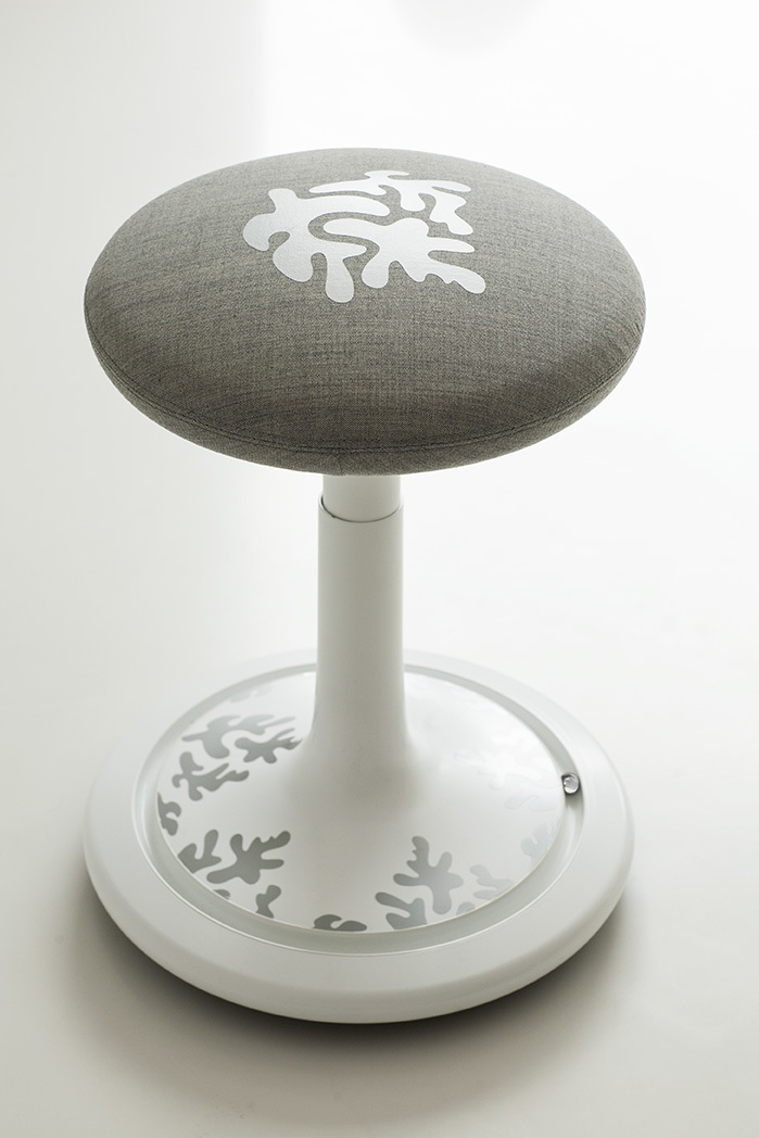 The Ongo Rhei Chair, the first of the special edition „designers’ collection“ is a contemporary production of an ergonomic design stool. It was developed in collaboration of reginadahmeningenhoven and Beate Steil and is the first of the special edition „designers’ collection“. Movement releases the energy of flow and stagnancy is interrupted by the Chair. Not only the product – the design of Ongo Rhei Chair is the visualization of movement, too. Everything flows. The unusual mix of textile and metallic printing is appealing with its simplicity in terms of colour.