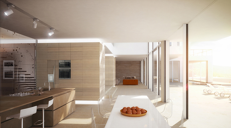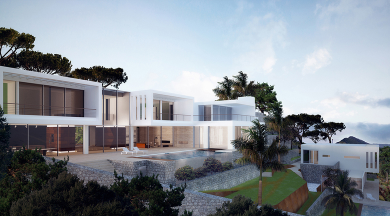 The Villa Velasquez is located in the urbanization "Montport" in Port Andratx, at the edge of a green zone. Its buildings fit harmoniously into the Majorcan environment. The project is characterized by a modern, light-filled design, a luxurious living concept and a constructional implementation of newest building and energy technology. The energy concept of the "Villa Velasquez" is largely based on the use of renewable solar energy, which is used for heating the property and pools and in the summer months for air conditioning. The built-up area in the main and guest house is a total of 1500 sqm. Spatial limits disappear through a continuous, homogeneous flooring between interior and exterior. The villa gets its character and livability by the materials and colors as well as the lighting concept.