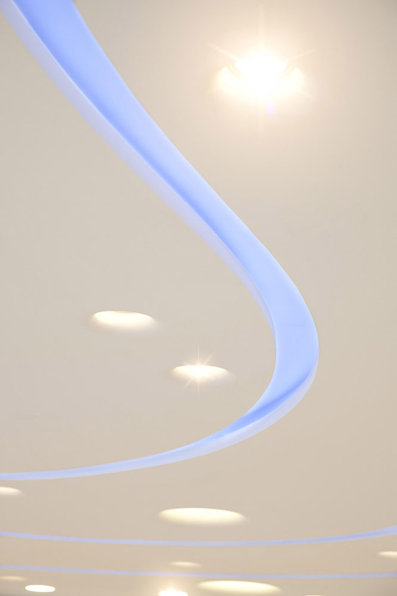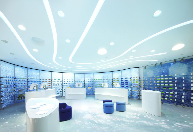 For redesigning this established pharmacy in munich reginadahmeningenhoven choose the theme that water is attributed a healing effect. Deep blue and radient surfaces characterise the salesroom and consistently reflect the wet element. The wall’s organic curves were printed with glittering photo wallpaper featuring the motif of ocean’s surface and are fully backlit. Built-in shelves frame the whole scenario. A significant design module ist the ceiling, which with freely arranged points and strips of light projects water-like plays of light onto the shining floor. Detached movable white service counters appear like stones on the bottom of the sea and integrate into the shop concept. The relocation of the drugs storeroom with an automatic selector to he basement allowed for the extension of the salesroom.