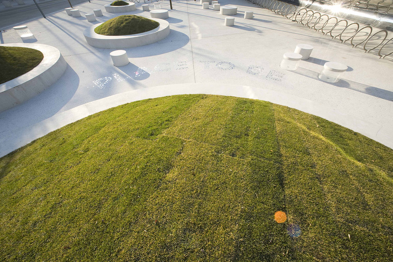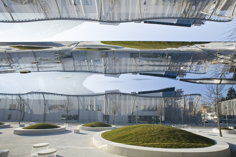Linked to the Swarovski Veil a smooth outer space with seating, lightened pads and bicyle parking is created. A new feature is the bright and consistent Creative concrete, which acts like sandy bottom and marks a new gentle urban space instead of the usual asphalt. Even the opposite side of the street is incorporated in the shape of a grove lined with silverlimes. This creates a fluid transition to the public space. Veil, landscaping, illumination and the design of the space merge to become a breathtaking backdrop. A group of illuminated pads creates a seating arrangement and doubles as the boundary to what lies beyond… During the day, rays of sun and traveling clouds revel in this space, triggering a constant change. When night falls, a spectacle takes place that lives in harmony with the hues of the sky. This setting forms the groundwork for a permanent and enchanting transformation. Swarovski a new place to be…