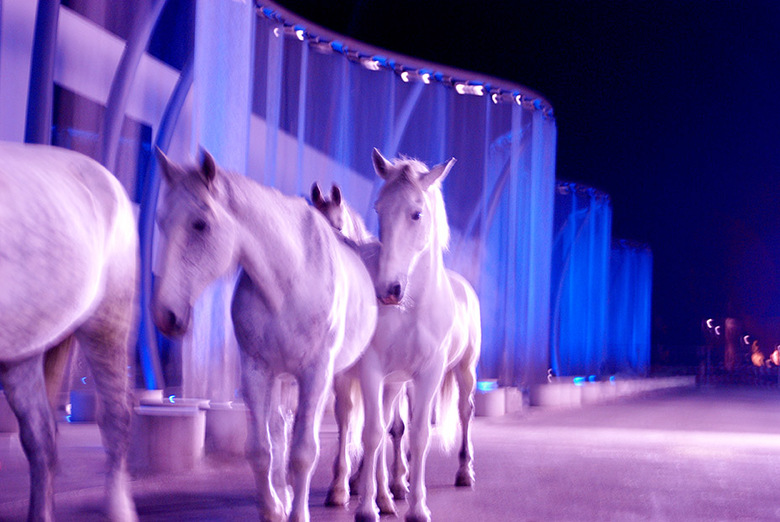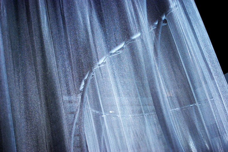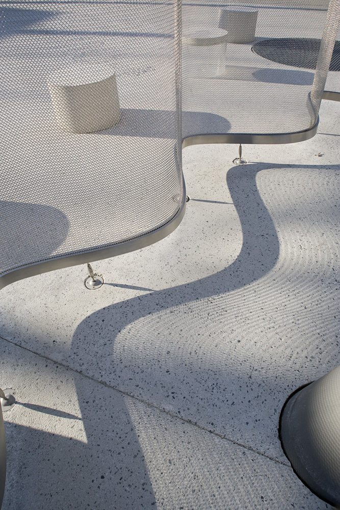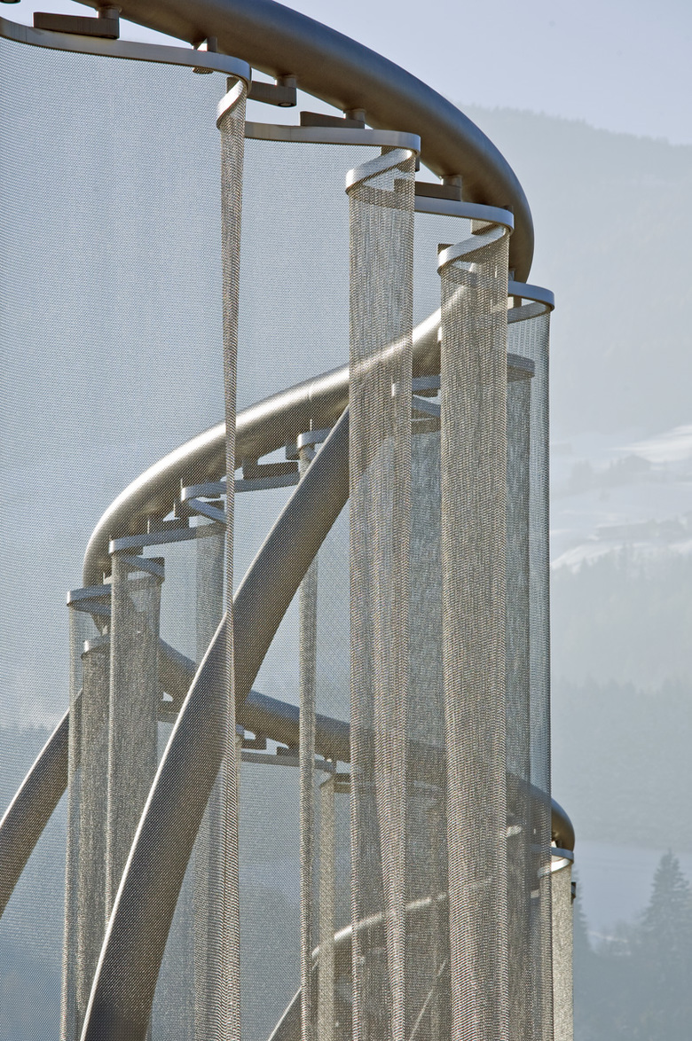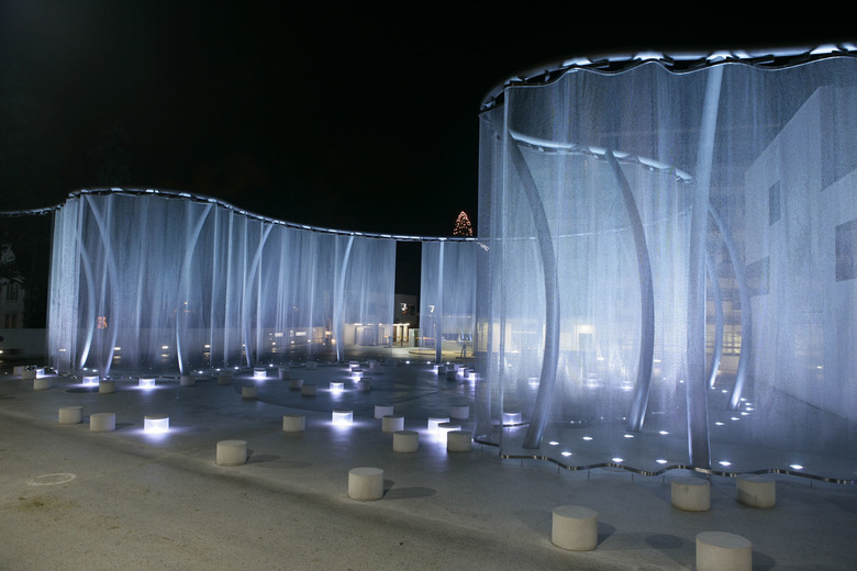 This sophisticated and fantastic veil has been completed in 2008 for the Swarovski works in Wattens, Austria. The Veil transforms the Swarovskistraße in a bright boulevard of constant magical change. The new pathway marked by the billowing veiled curtain becomes a new place of poetic play; of light and shade; of an iridescent dalliance of colors and of amazingly magical moments of expression and transformation. During the day, rays of sun and passing clouds toy with the new space, creating a continual metamorphosis. Depending on how the sunlight meets the curtain and on the visual angle, the curtain emerges either as a dazzling, sparkling veil or vanishes completely from the eye. The incessant transformation of the curtain at daytime triggered by the sun and the clouds is emulated at nightfall by luminaria. A peaceful start, as if by magic, triggers an interaction of color with the hues of the sky. The intensity of the light adapts to the surrounding brightness; not glaring or vying for effects, but of a harmonizing and soothing quality. The lighting dims. We gently draw the curtain. The silent movie starts and follows a virtual script composed of an overture, calming shades, quick and quiet rhythms. The veiled curtain forms the groundwork of the installation. The soft change of color and lighting makes the curtain radiate like a crystal, with an opulence of hues ranging from mythical blue to a clear, bright white. Like all other design elements, the light conveys an activating seeing. Like creatures of the light and natural phenomena, the statures rejoice in merry games. The veil is made of a corrosion- and weather-resistant stainless steel mesh. It gives rise to a varied play of light and embodies a never-before seen materialness, held in place by a 10-meter high steel stringer. A group of illuminated pads creates a seating arrangement and doubles as the boundary to what lies beyond… During the day, rays of sun and traveling clouds revel in this space, triggering a constant change. When night falls, a spectacle takes place that lives in harmony with the hues of the sky. This setting forms the groundwork for a permanent and enchanting transformation.