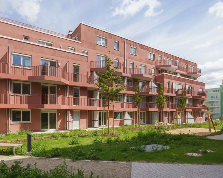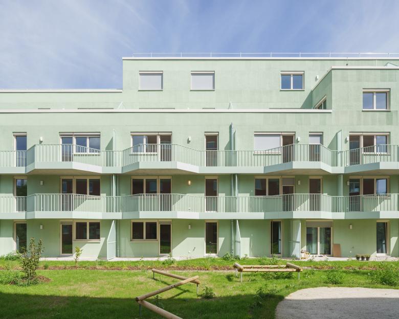 Das bestimmende gestalterische Element der Häuser sind die umlaufenden Brüstungsbänder und die starke Farbigkeit der einzelnen Gebäude in den Komplementärfarben Rot und Grün. Die von uns vorgeschlagenen intensiven Farbtöne nehmen Bezug auf historische Gebäude der 20er Jahre in München, welche - typisch für diese Zeit - ebenfalls über stark farbige Putzfassaden verfügen; Beispielsweise der grüne Mollblock auf der Theresienhöhe von Otho Orlando Kurz oder die rote Wohnanlage in Laim von Emil Freymuth.