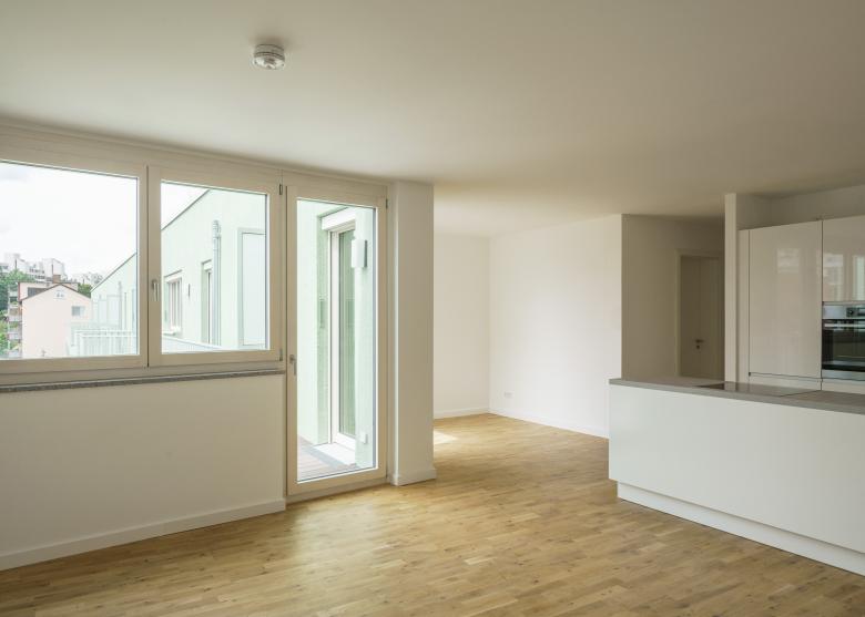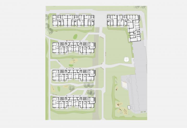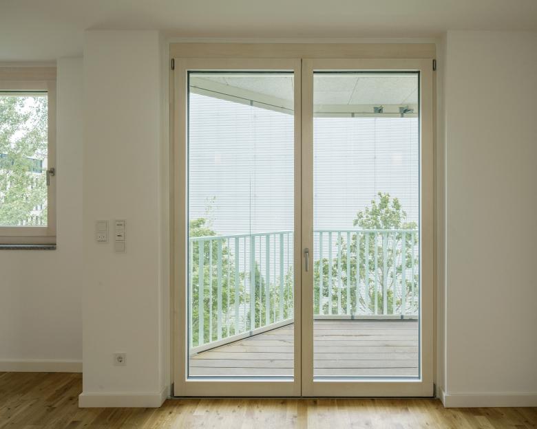 In Verbindung mit den auskragenden Balkonen bildet sich eine Schichtung, welche die rigiden Volumen des vorgegebenen Städtebaus auflöst und den Gebäuden Maßstab und Proportion verschafft. Die Außenlinie der Balkone ist über die einzelnen Geschosse bewusst nicht einheitlich um Abwechslung und Vielfalt zu erzeugen. Die gekantete Kontur der Balkone erinnert an die Zahnräder von Motorgetrieben und an die industriell geprägte Nachbarschaft des Quartiers.