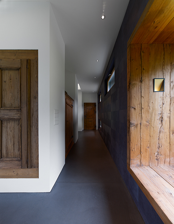 Naturholzfenster bilden einen Kontrast zu dem harten alpinen Material und schaffen vor allem im Innenraum eine wohnliche Atmosphäre.