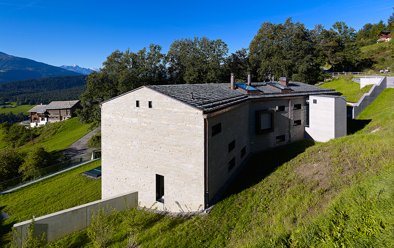 Im Norden bildet die massive Fassade mit einer rauen Natursteinoberfläche einen Schutz gegen den Hang und die Strasse.