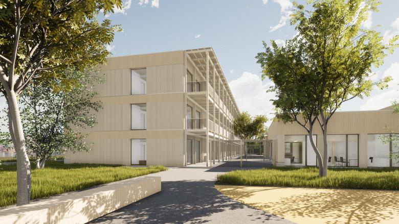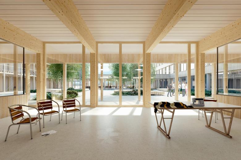 Das Material Holz schafft nicht nur eine angenehme, stressfreie Atmosphäre im Bundesasylzentrum, sondern überzeugt auch durch kurze Bauzeit, einen hohen Vorfertigungsgrad, niedrige Grauenergiewerte und regionale Wertschöpfung.