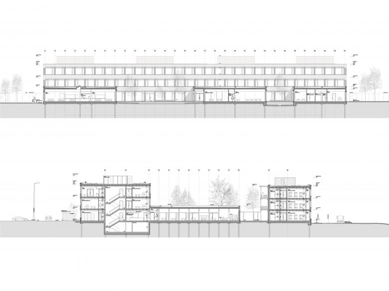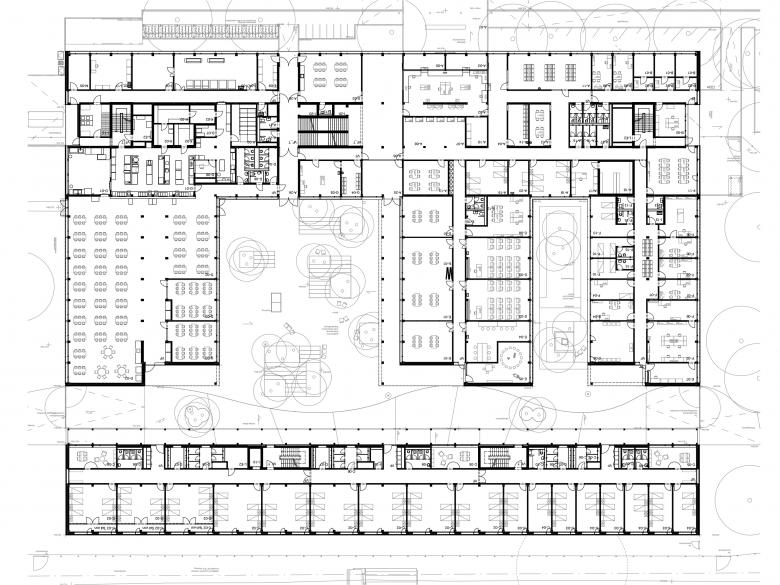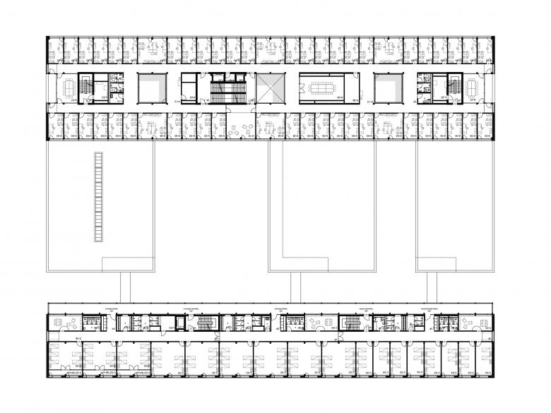 Drei eingeschossige Pavillons für gemeinschaftliche Nutzungen werden gerahmt vom Verwaltungsgebäude im Westen und dem Wohnteil im Osten, zwei Riegeln in Nord-Süd-Richtung. Dank der hohen Flexibilität sind nachträgliche programmatische Änderungen problemlos umsetzbar.