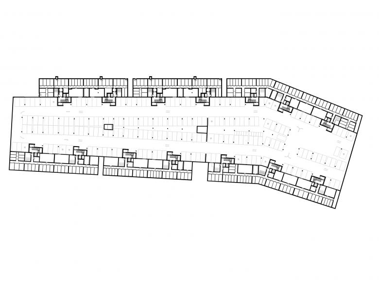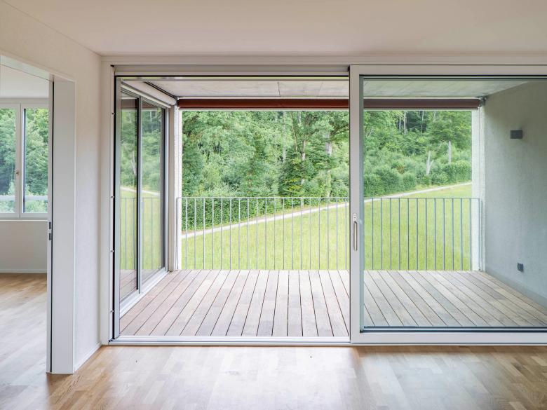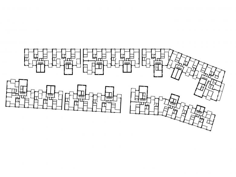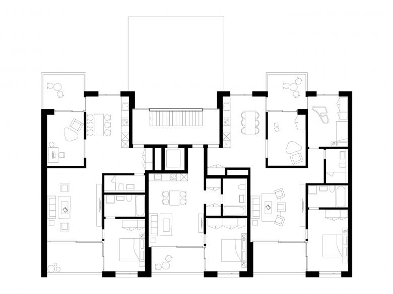 Tröge aus Beton schaffen einen graduellen Übergang vom kollektiven zum privaten Aussenraum. Sitzgelegenheiten bieten Raum für Begegnung. Die Bepflanzung durch Blaseneschen stiftet Identität und kreiert eine malerische Atmosphäre. Die Wohnungen werden direkt aus der Logik des Masterplans abgeleitet: Jeder wohnt am Grünen. Die Ost-West-Orientierung ermöglicht Grundrisse mit durchgehenden Wohnbereichen, um sowohl von der weiten Landschaft wie auch von der Qualität des Quartierhofes zu profitieren.