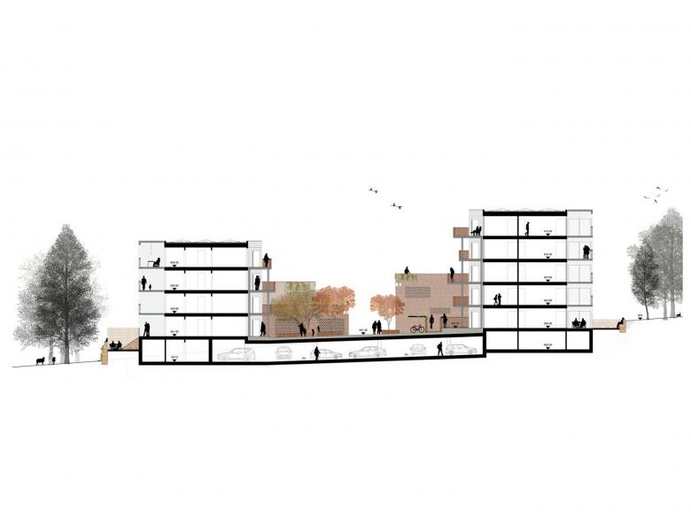 In den lang gestreckten, platzartigen Höfen kann sich das soziale Leben des Quartiers voll entfalten. Sie sind offene Gefässe für Spiele, Treffen und Feste. Als durchgehender Belag wird gelber Mergel verwendet. Die Hauptverbindungen sind als Ortbetonbelag mit feinem Besenstrich materialisiert und führen zum Gemeinschaftsraum, welcher sich am Ende des Innenhofes befindet und zum Wald ausgerichtet ist. In den vorspringenden Hofbauten sind für die jeweiligen Wohnhäuser die Waschküche, Kinderwagen- und Veloräume platziert. In den Obergeschossen wird das Angebot mit einzelne Studio-Ateliers ergänzt. Diese Backsteinvolumen strukturieren den Siedlungsraum und schaffen klare Adressen.