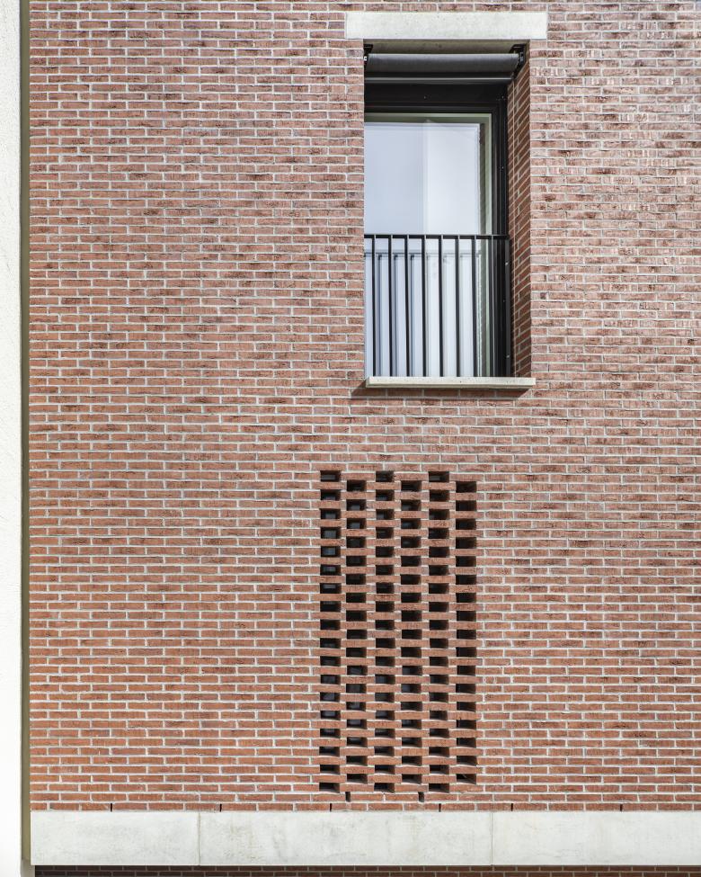Der Siedlungsraum des Baufeldes B ist mit seinem vielfach gegliederten Quartierhof eine veritable Nachbarschaftsmaschine am Grünen. Alle architektonischen Elemente, die sich ausserhalb der Gebäudekörper befinden, sind aus vor Ort gemauerten Backsteinelementen hergestellt. Dies erzeugt eine starke Identität und signalisiert eine hohe Wertschätzung des kollektiven Lebensraumes.